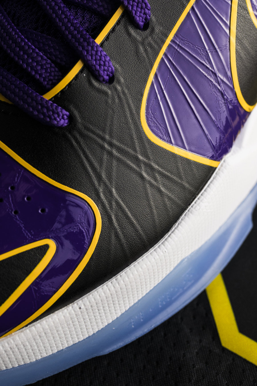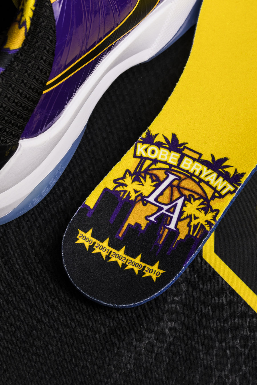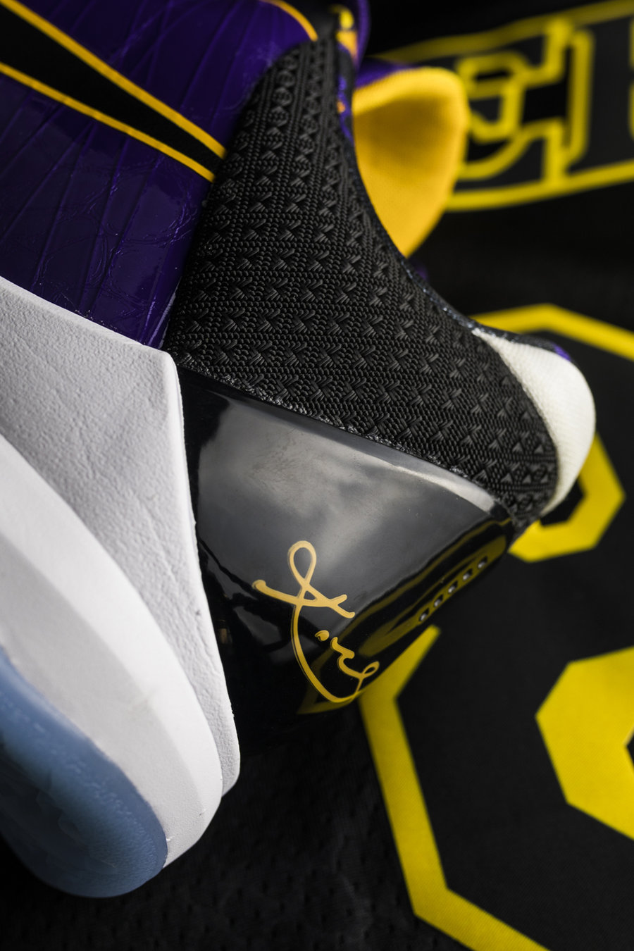 与一般紫金配色不同,鞋身采用紫、黑为主色调,黄色线条勾勒,灵感来自科比第二、第三次夺冠时所穿的夹克。
