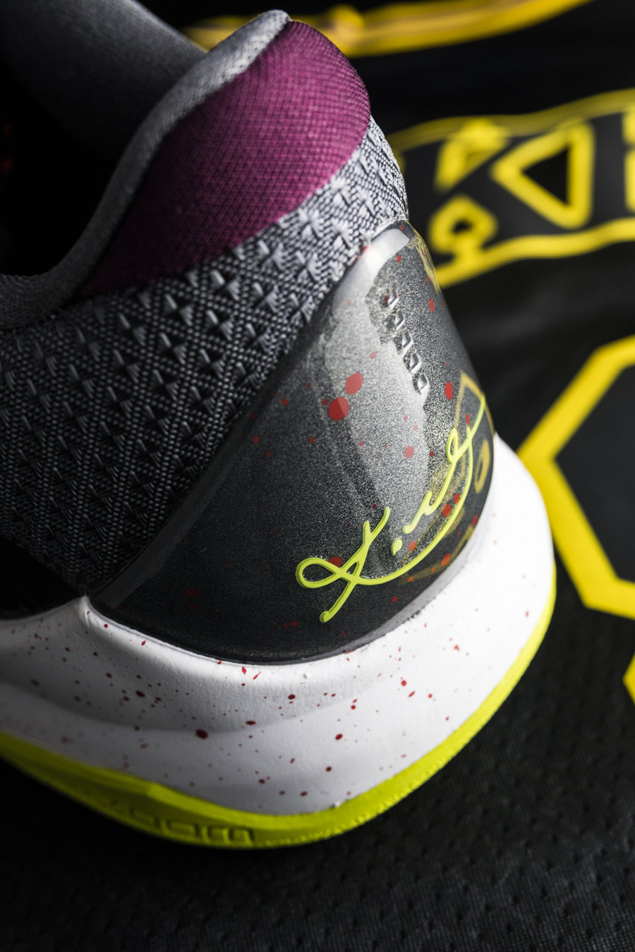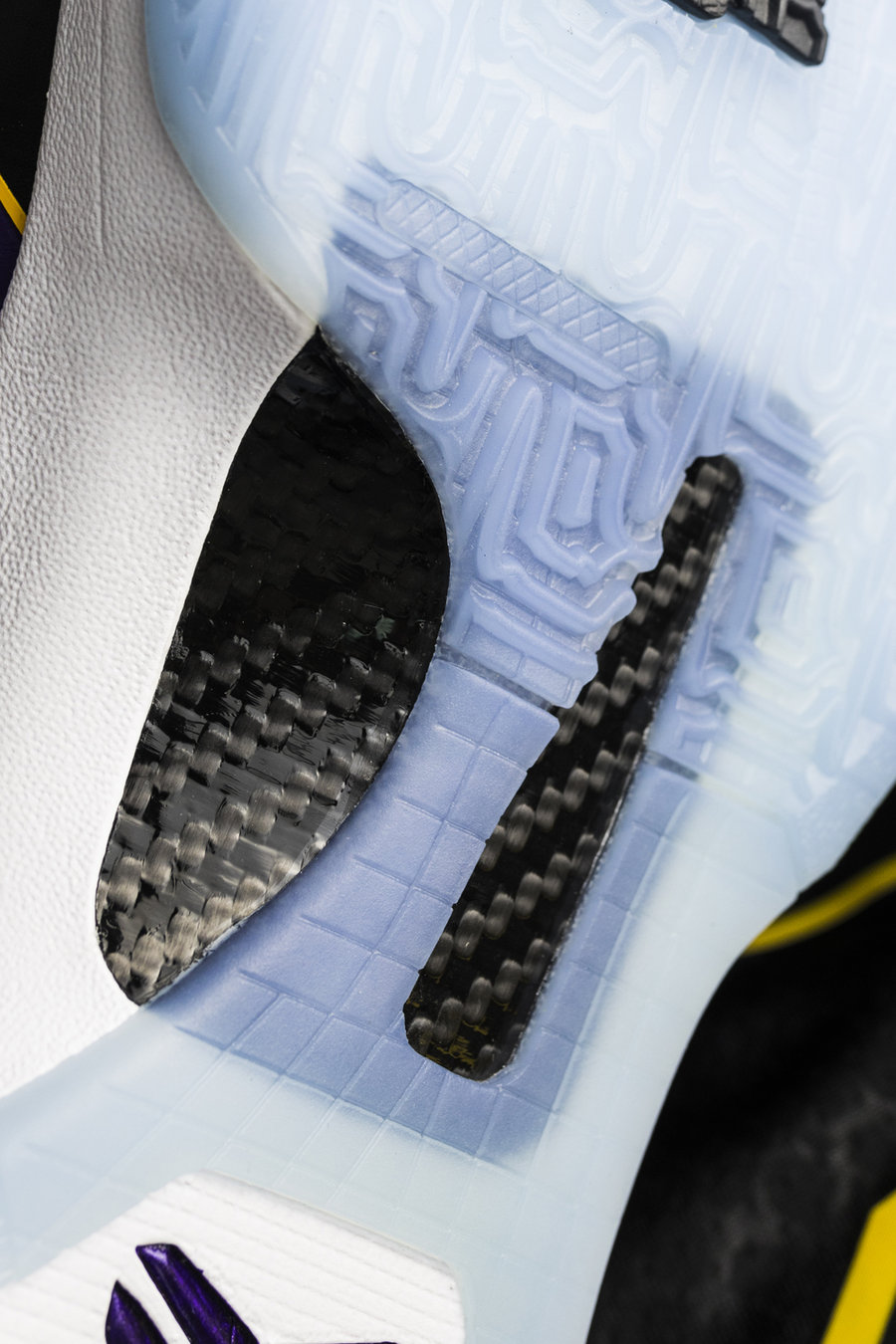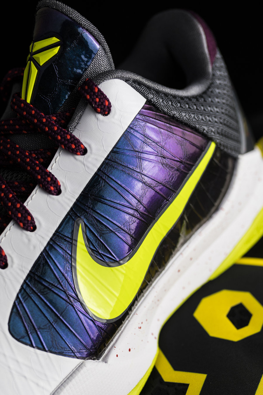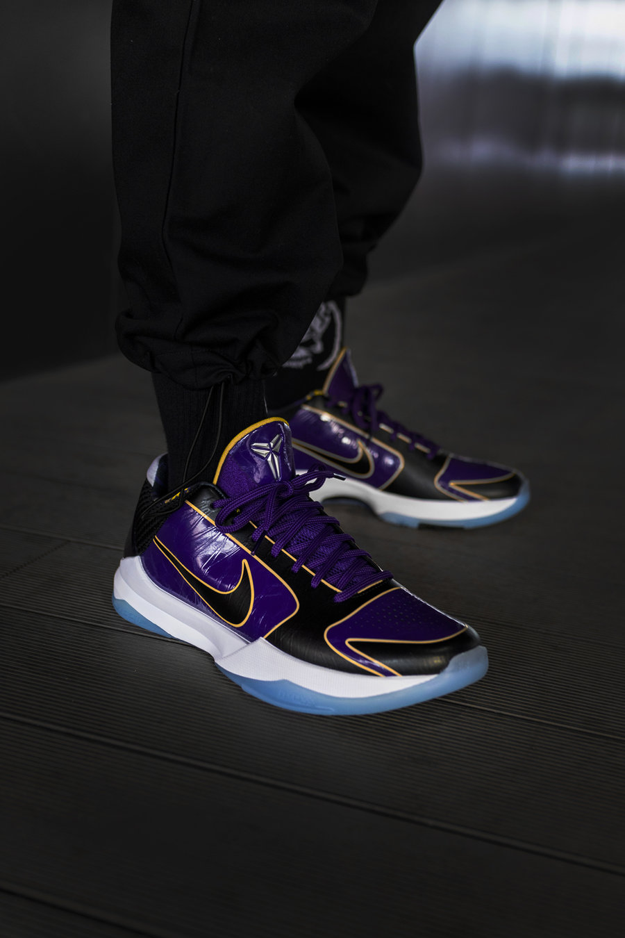 与一般紫金配色不同,鞋身采用紫、黑为主色调,黄色线条勾勒,灵感来自科比第二、第三次夺冠时所穿的夹克。