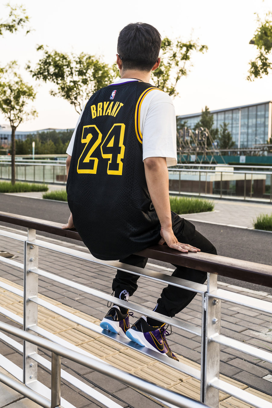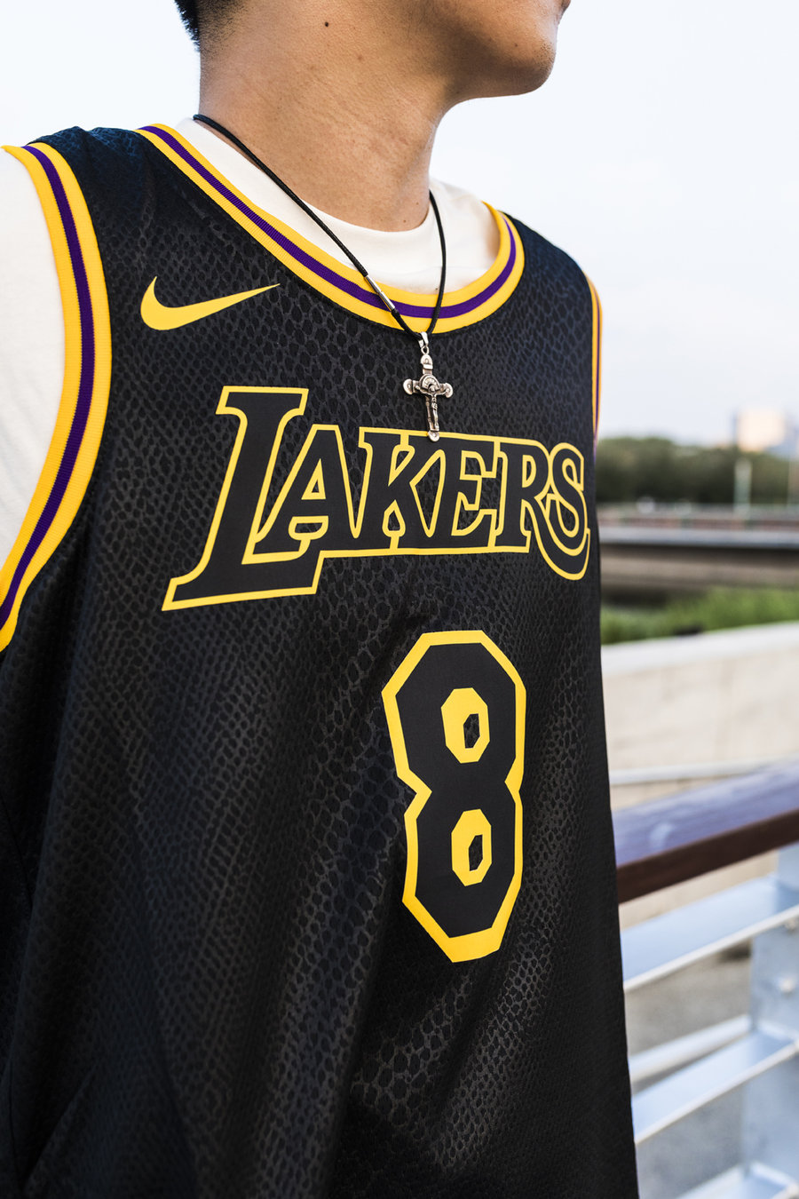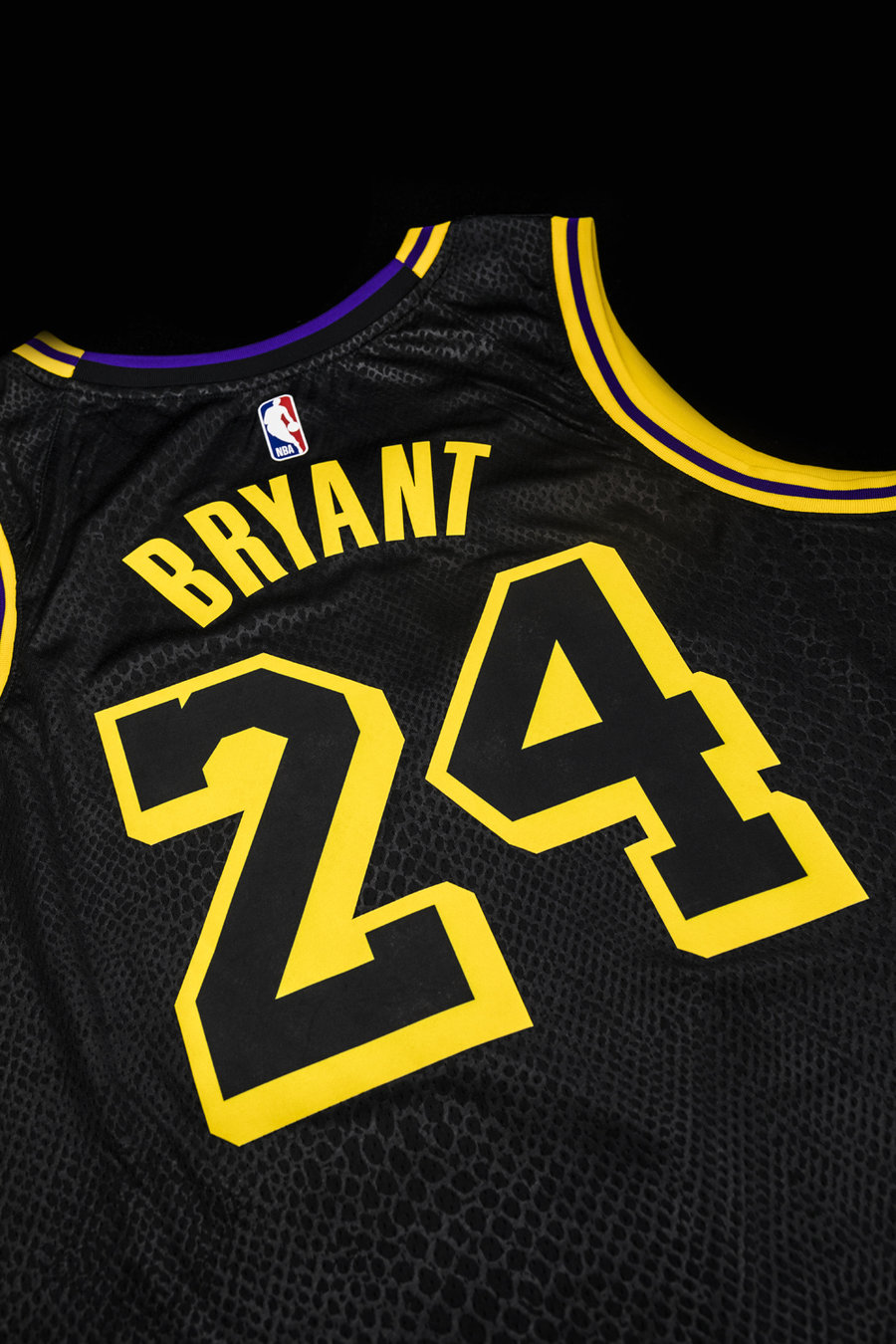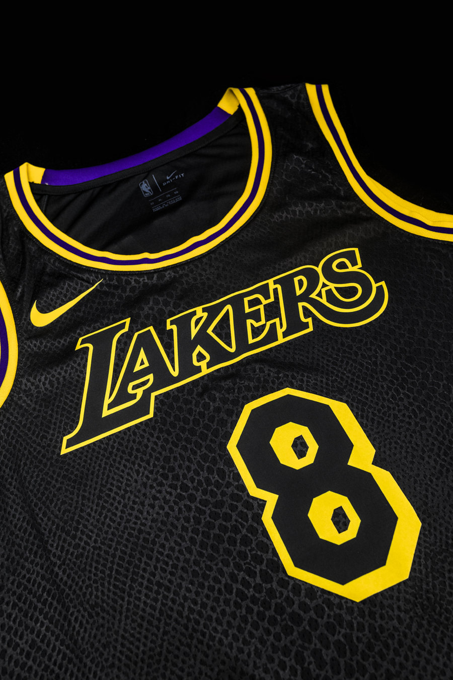 与球鞋共同登场的,还有一款特别的纪念球衣。以科比亲自设计的黑曼巴湖人球衣为蓝本。