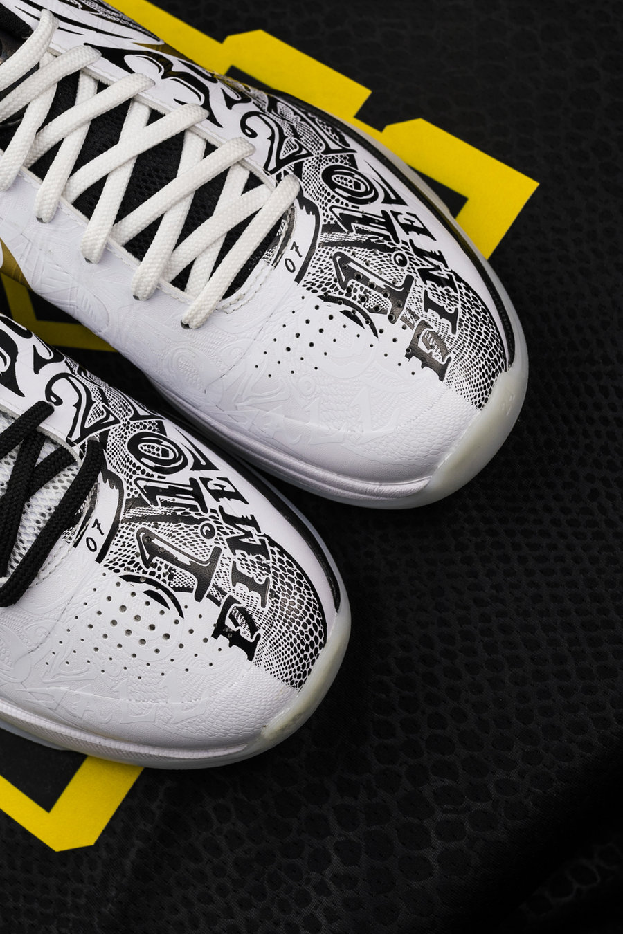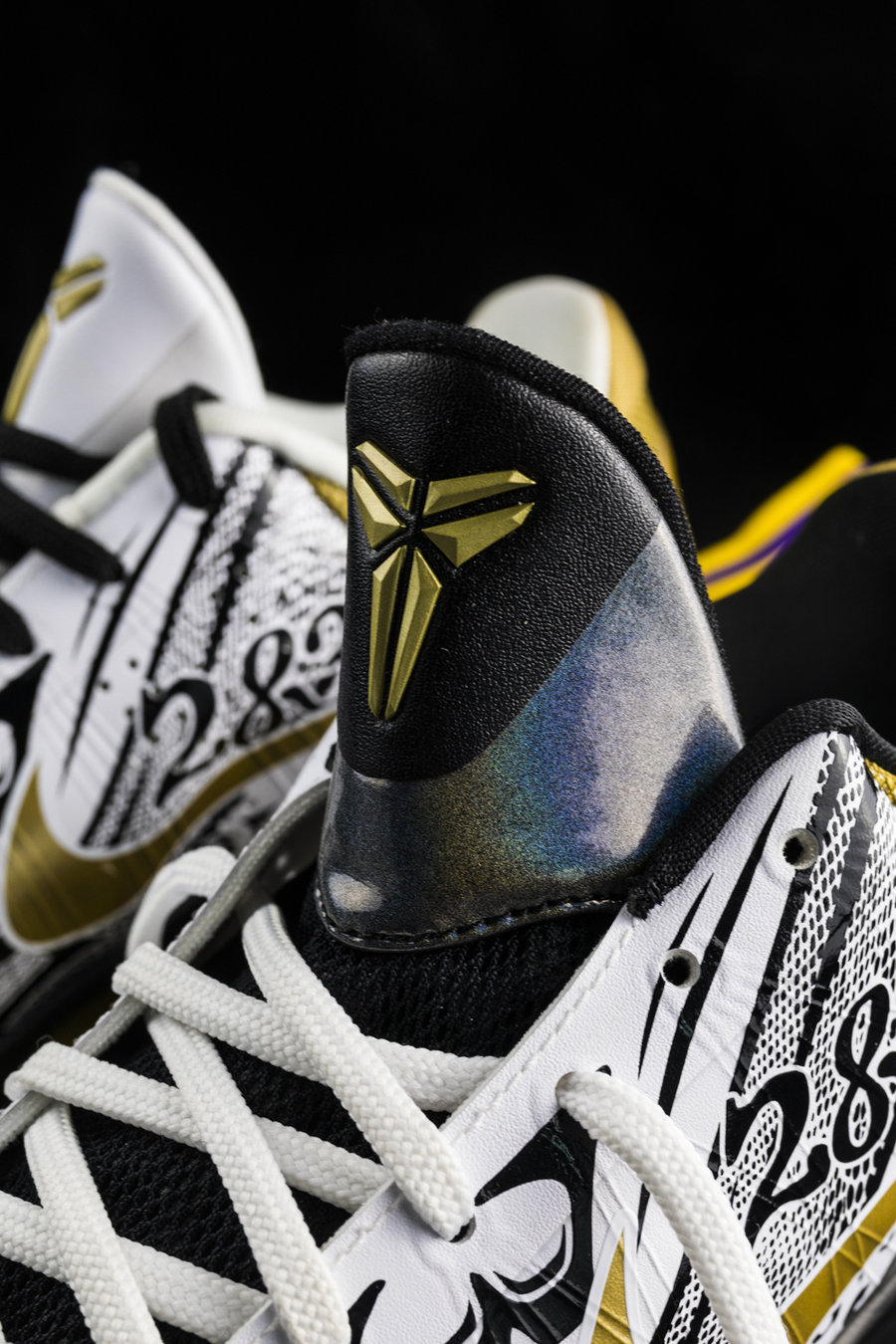 鞋面以酷似文身的大蛇和数字图案装扮,纯白一面如同文身般的暗纹,另一面黑色图案则得以显露,尽显黑曼巴的霸气凶猛。