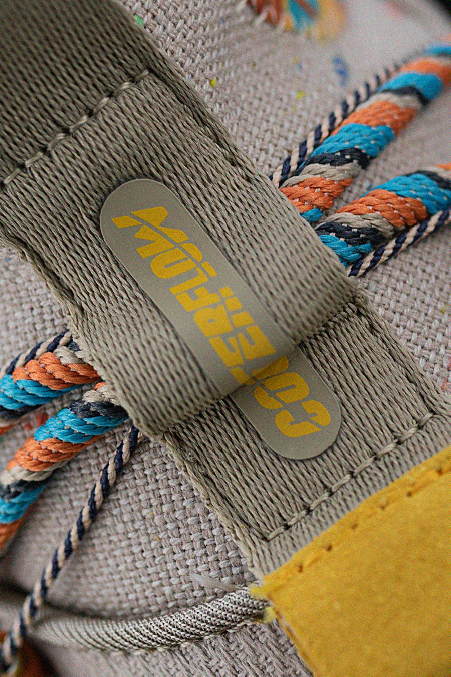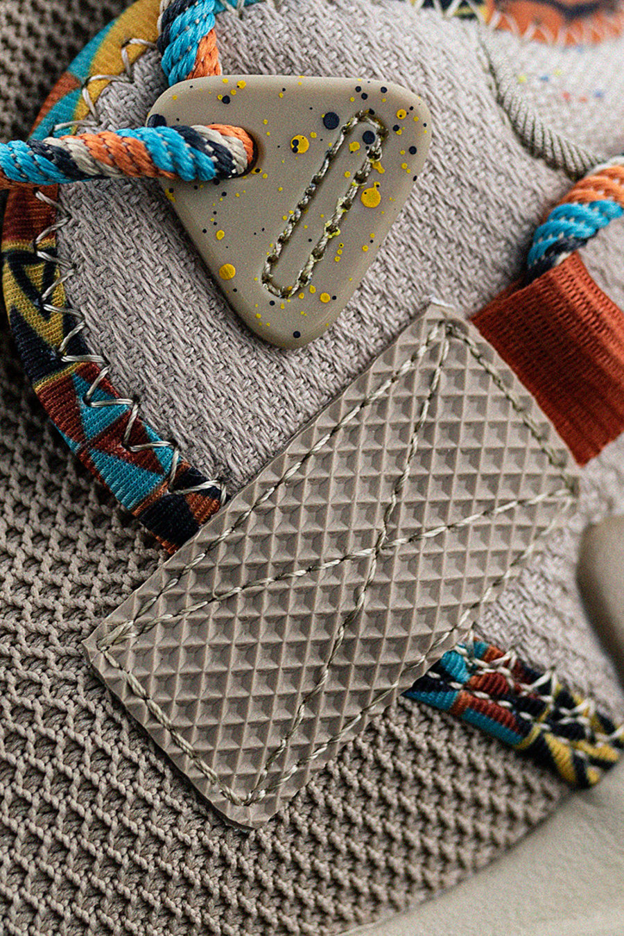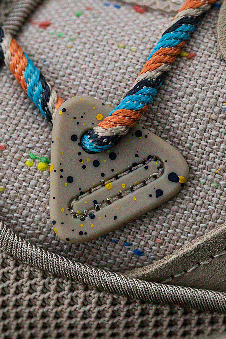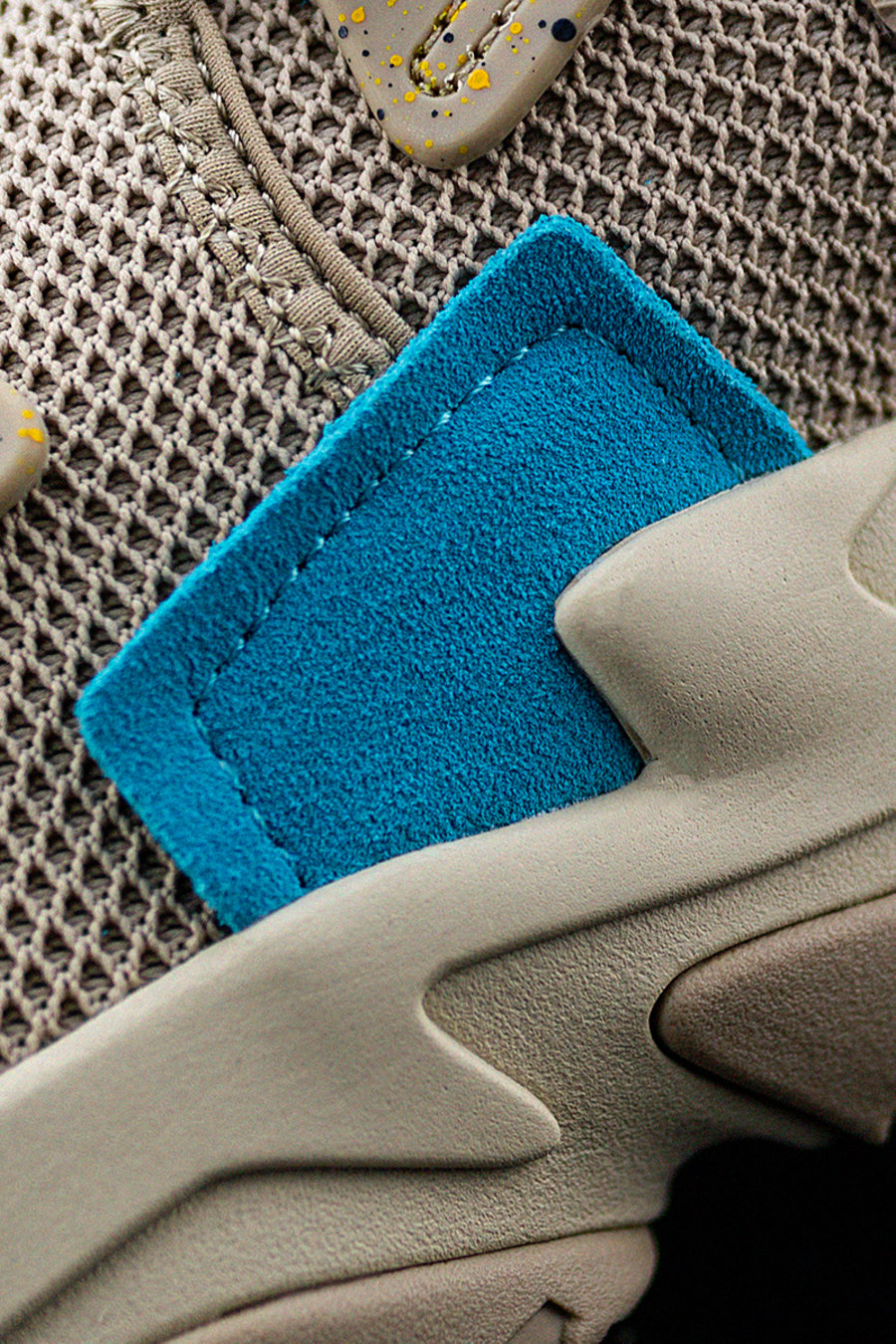 余下六个鞋带固定端则是以三角造型呈现,黄色、绿色等色彩的泼墨细节也为大地色系鞋身注入活力。