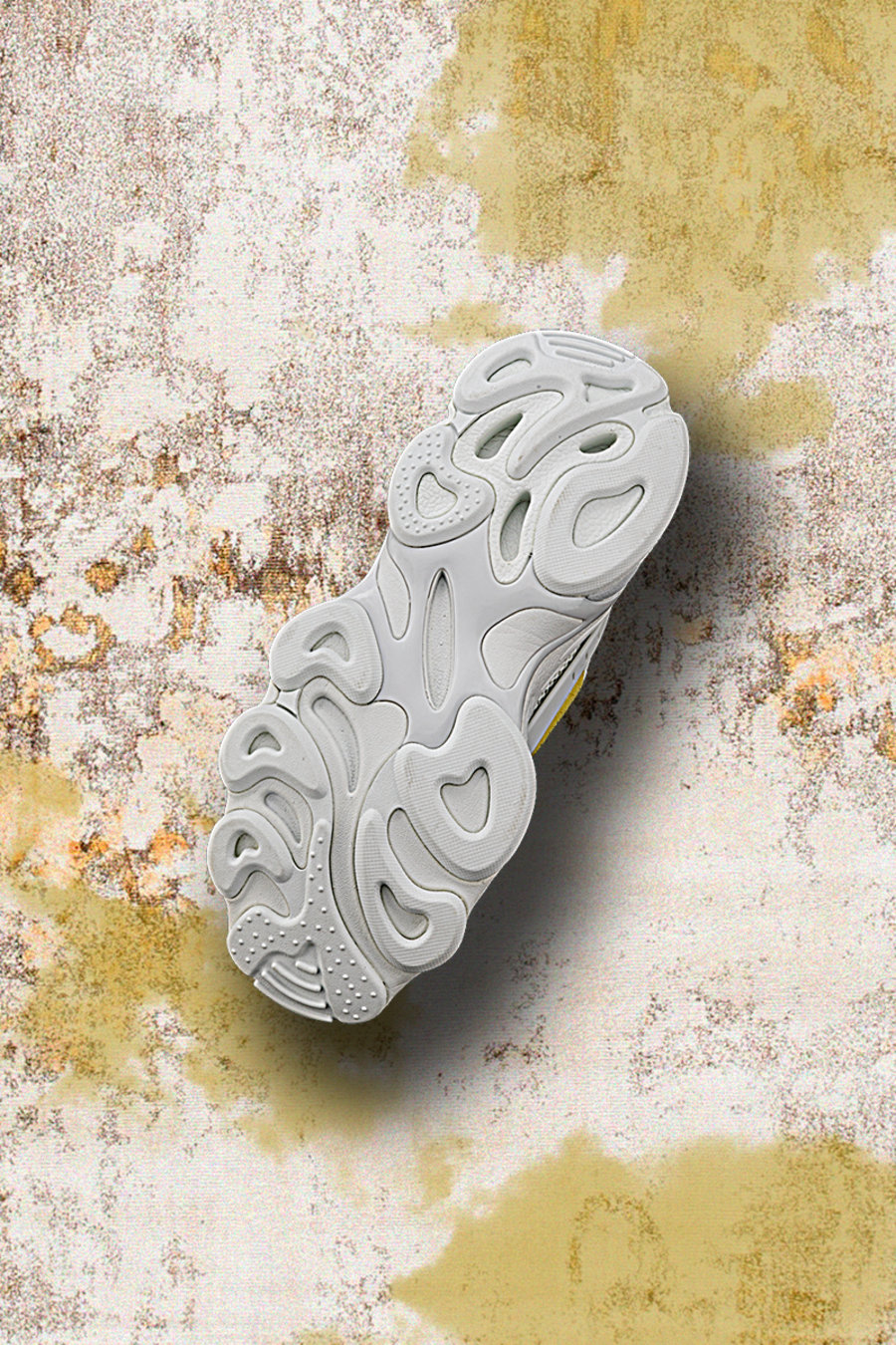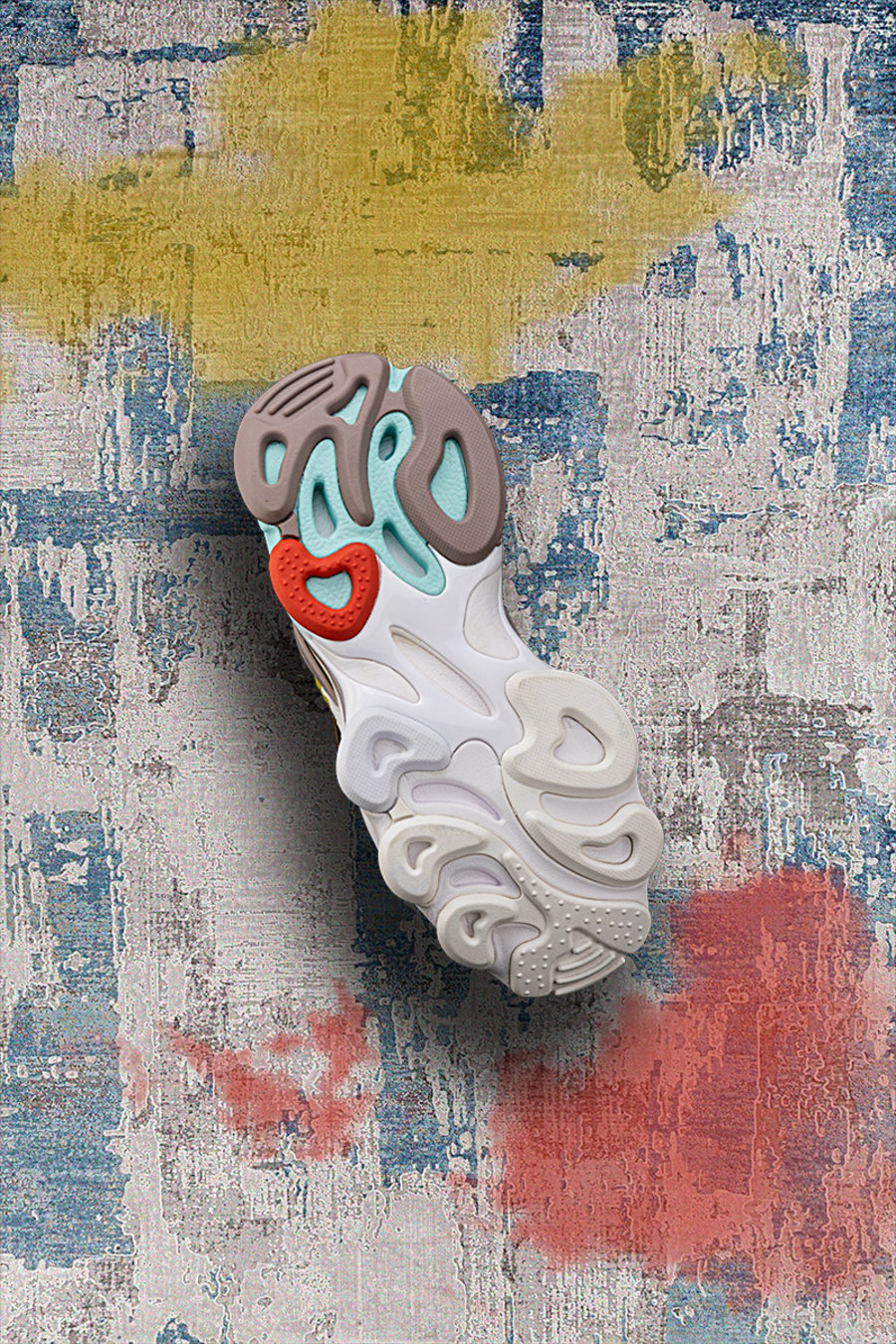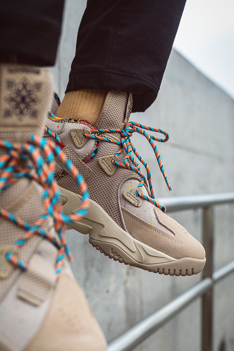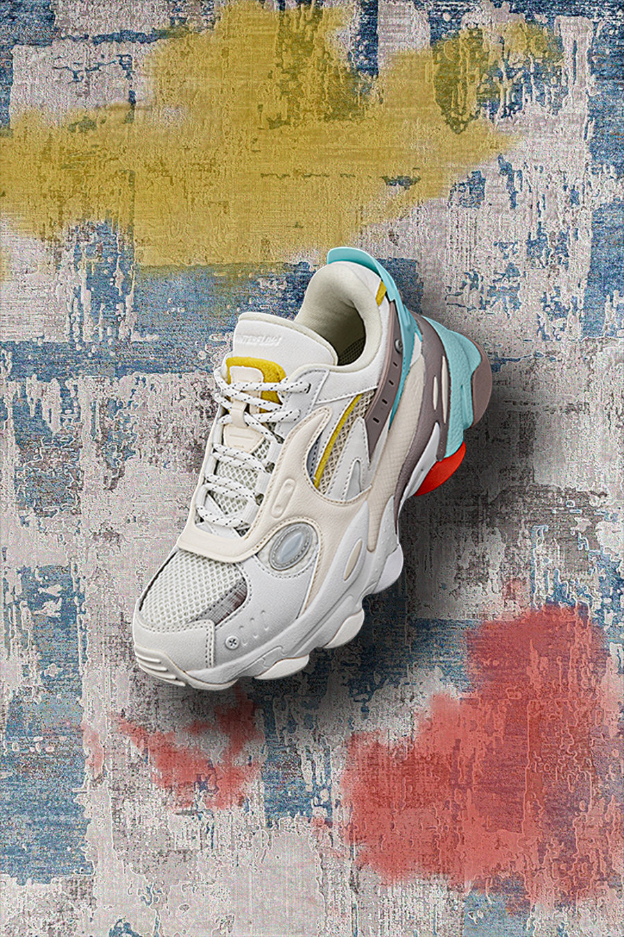 余下六个鞋带固定端则是以三角造型呈现,黄色、绿色等色彩的泼墨细节也为大地色系鞋身注入活力。