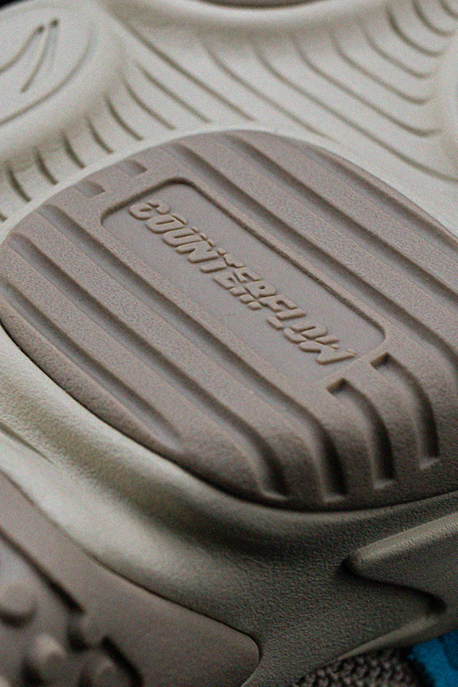 同时 COUNTERFLOW 字样展示鞋款身份。外底同样带有 COUNTERFLOW 字样,与后跟设计相呼应。