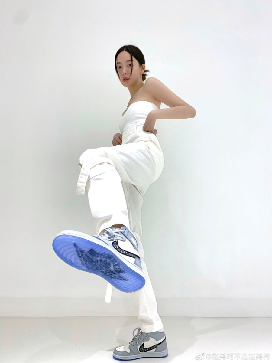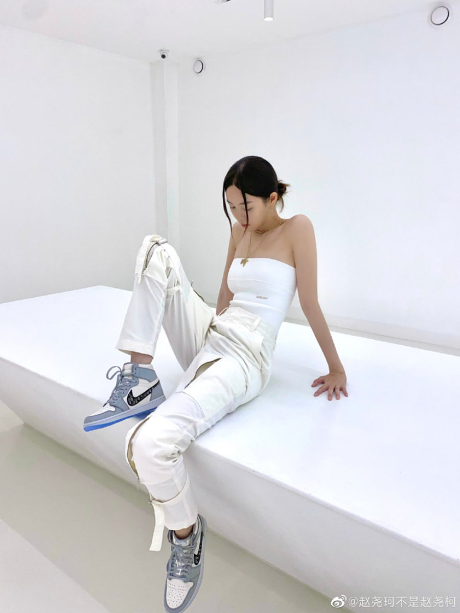 周雨彤再次上脚 OFF WHITE x Air Jordan 4,搭配 CELINE 黄色帽衫和白色宽松西裤,休闲时尚又不失潮流元素。