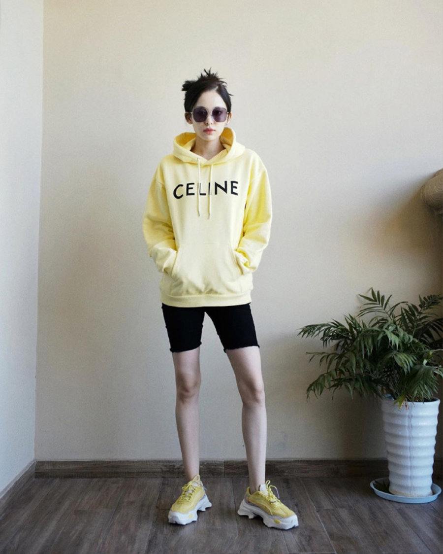 娜扎近日和周雨彤撞衫!同样身着CELINE 黄色帽衫的她上脚 Puma Nitefox Crossin,搭配黑色紧身骑行裤。两位女神的驾驭你更爱哪一个?