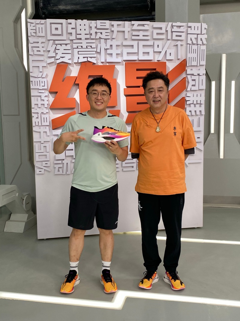 于大爷近期参加活动,上脚李宁的“国产最强跑鞋”!搭配橘色 T 和黑色运动裤。