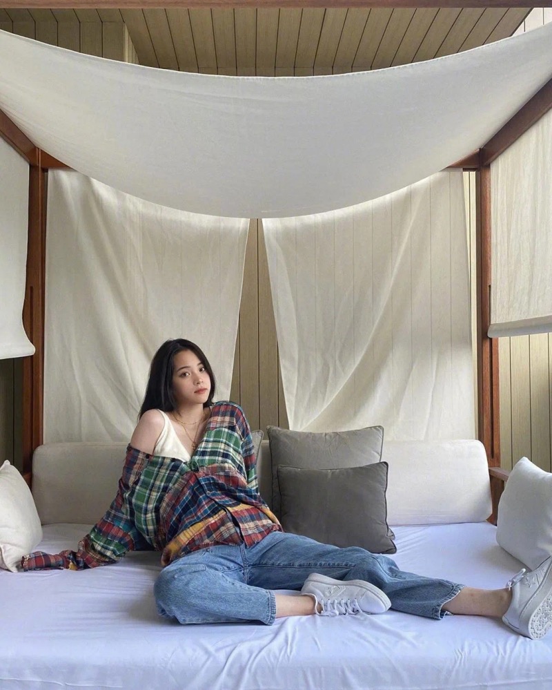 搭配宽松牛仔裤和 BM 抹胸,还是一贯火辣的 “卡戴珊家族身材”!
