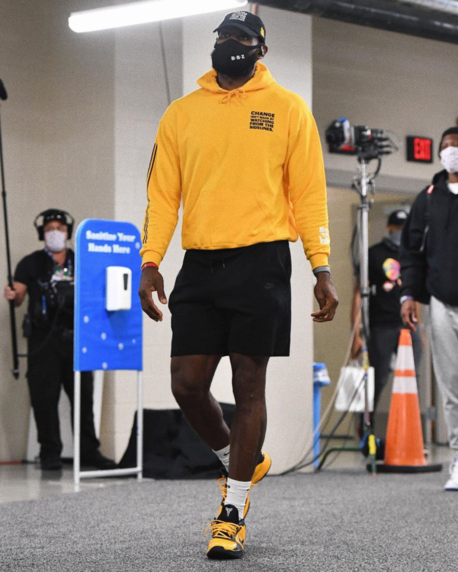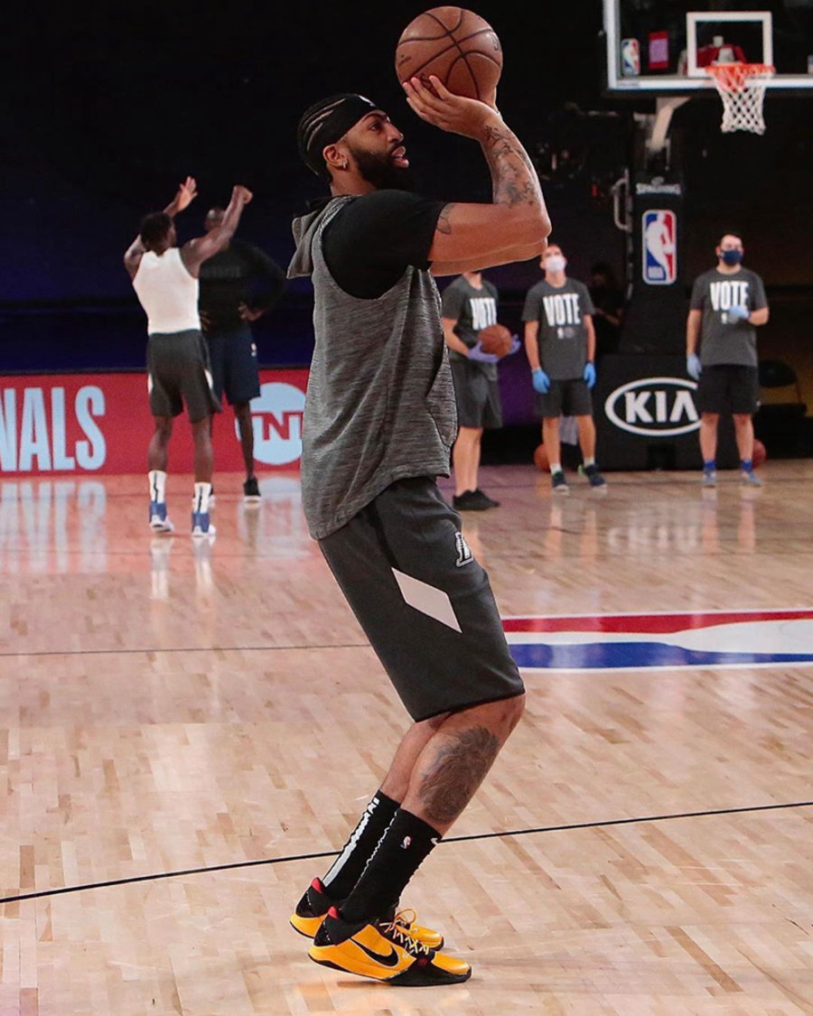 今天浓眉上脚的是还未发售的黄李小龙配色 Kobe 5 Protro,可以说是科比战靴极具代表性的主题配色。