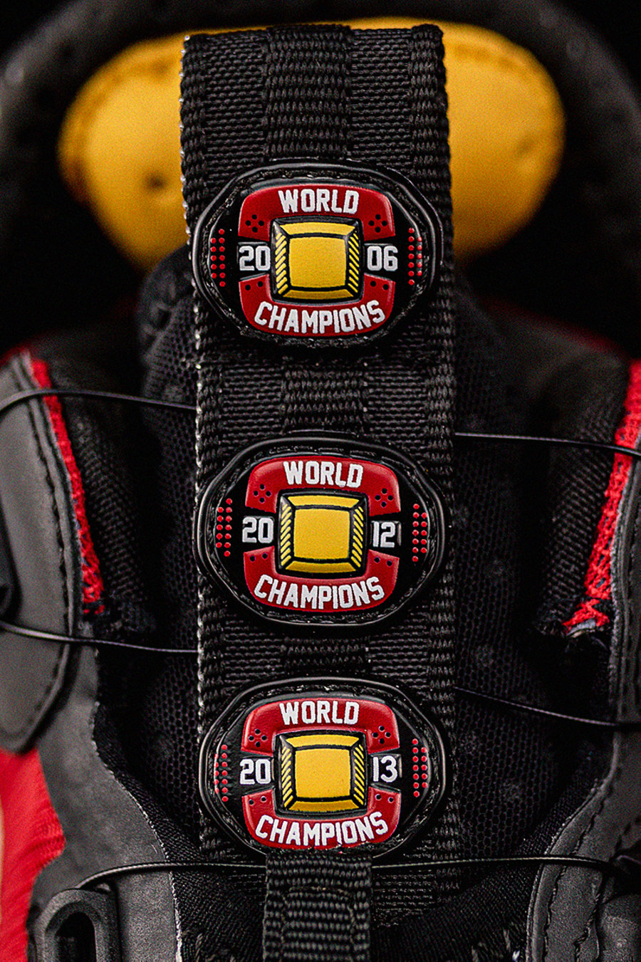 鞋舌带有三个戒指形徽章,2006、2012 以及 2013 分别代表韦德生涯获得的三座冠军。