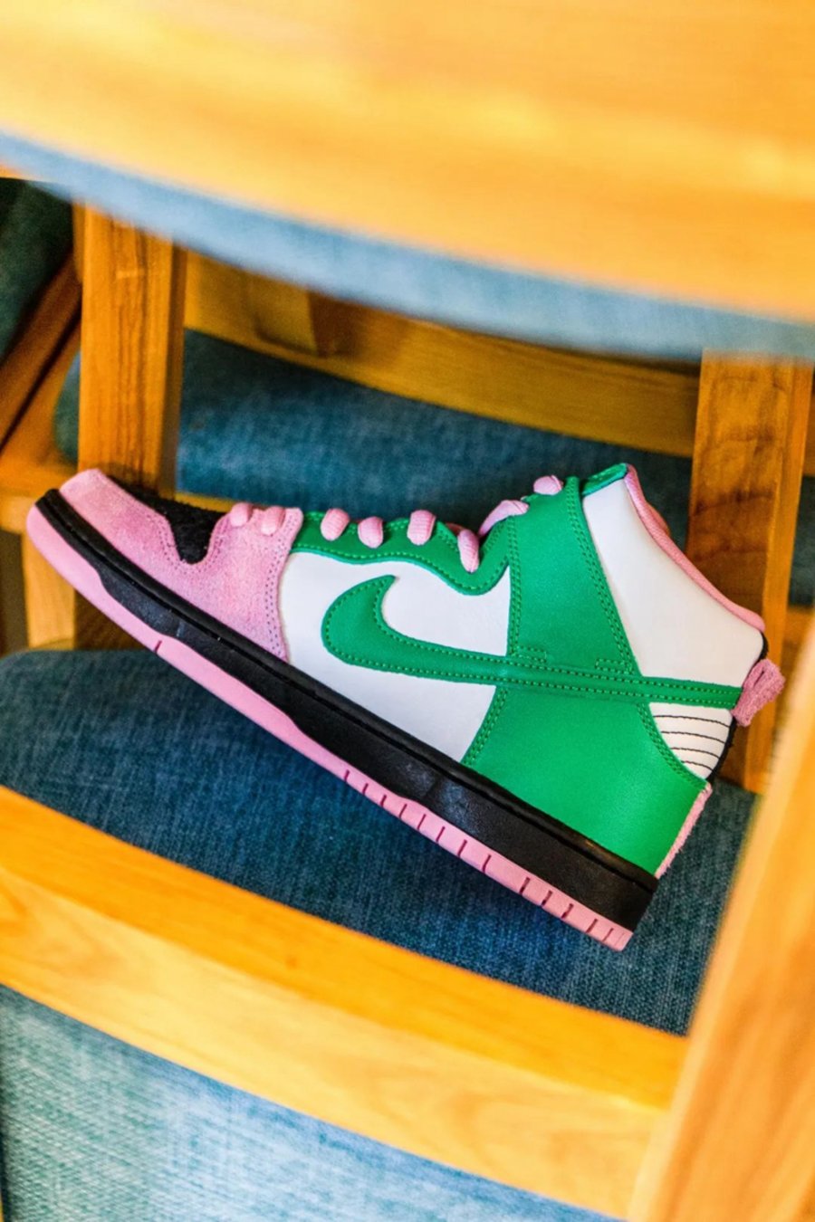 同样是近期上架的 Dunk SB Hi 新品,采用内外不对称的阴阳撞色,呈现樱花粉与绿色的视觉对撞。