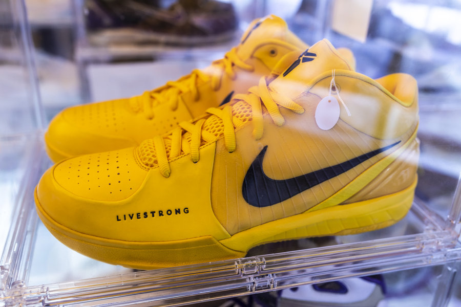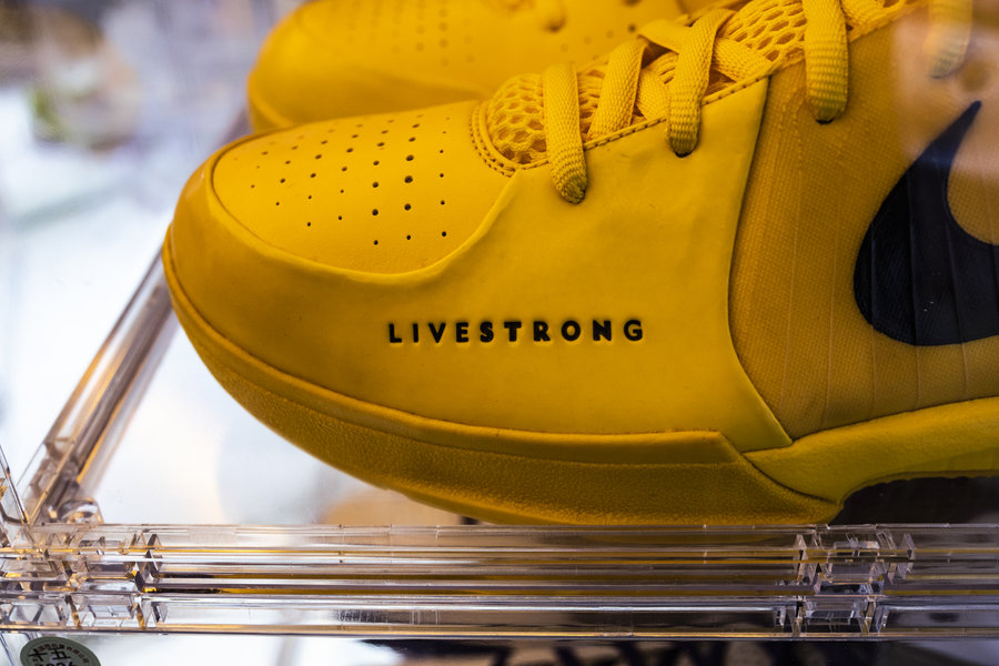 要论单双鞋最贵,也就是全场最稀有、拍卖价最高的一双,就要说说这双 Nike Zoom Kobe 4 “Live Strong” PE 特殊配色。