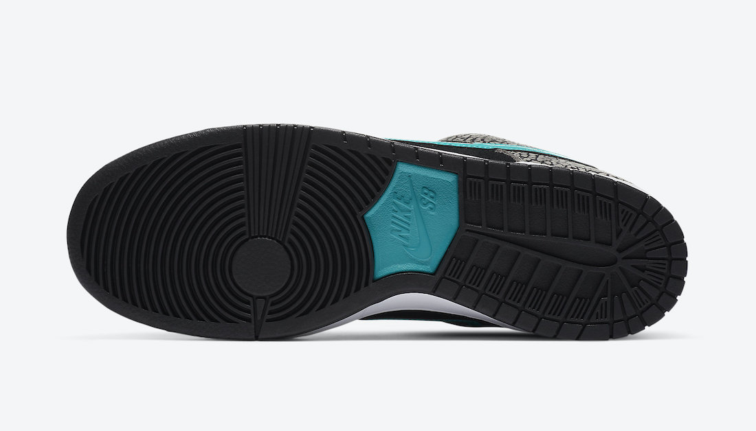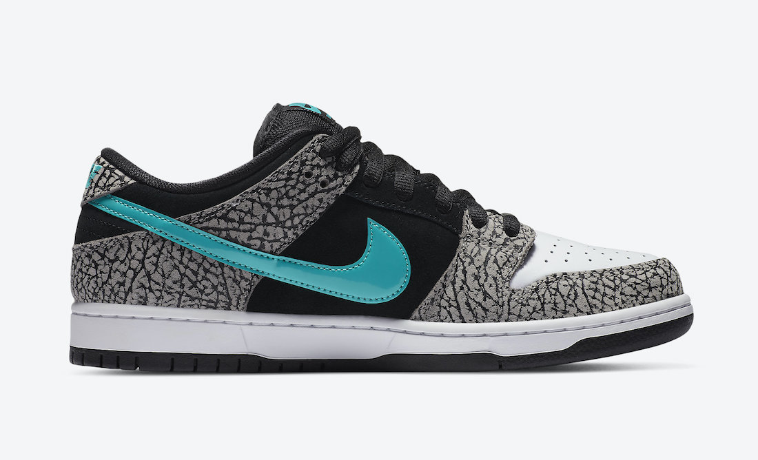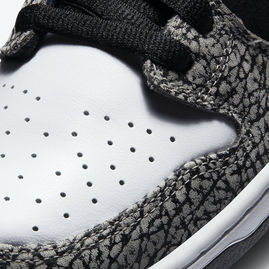 今年这双大象 SB Dunk Low 配色设计几乎照搬大象 Air Max 1,以灰色大象纹辅以白色皮革,以及黑色翻毛皮材质。