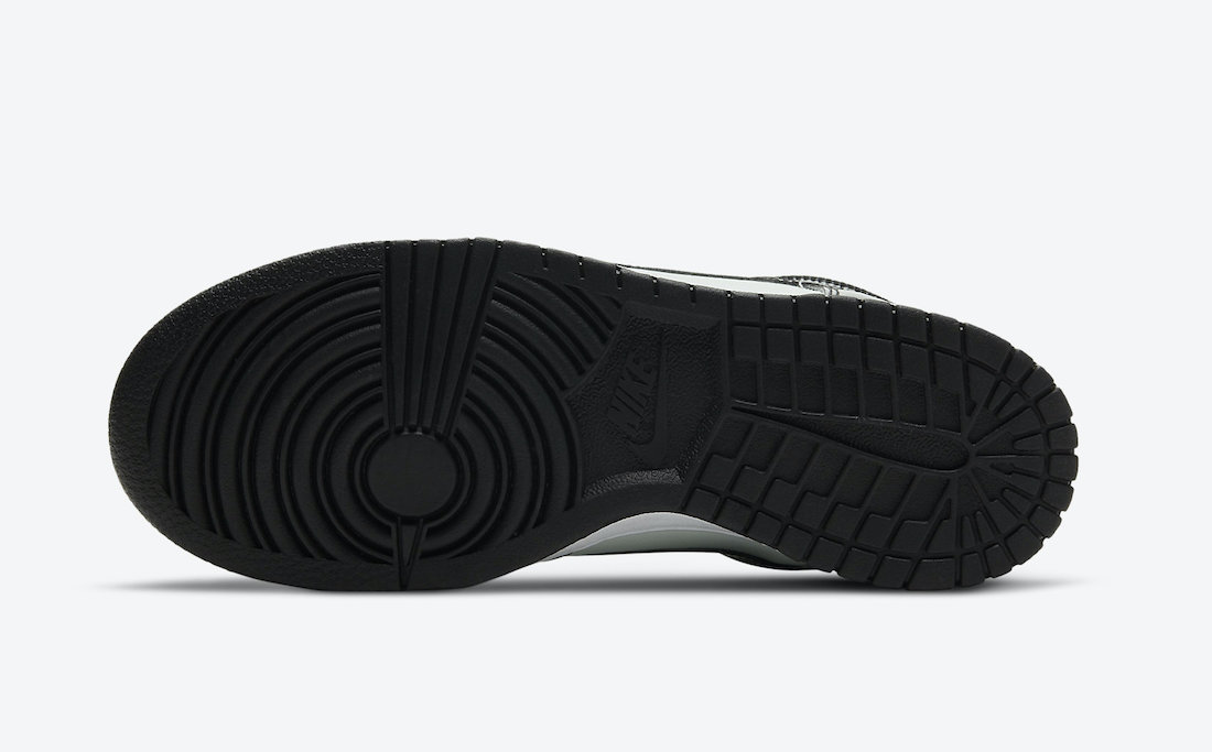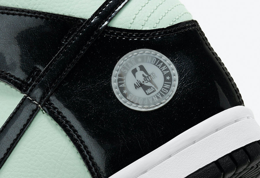 相比之下全明星 Dunk High 就特别许多,黑色漆皮框架下搭配清爽的淡绿色荔枝皮,黑色漆皮中还有闪粉效果。