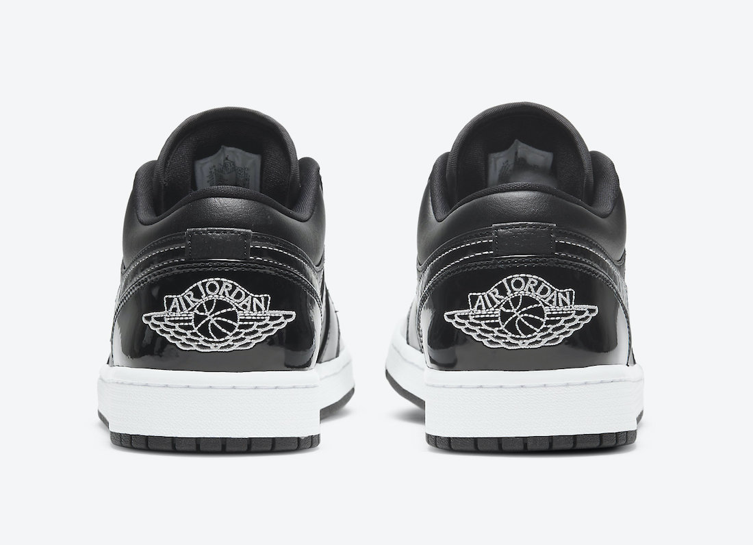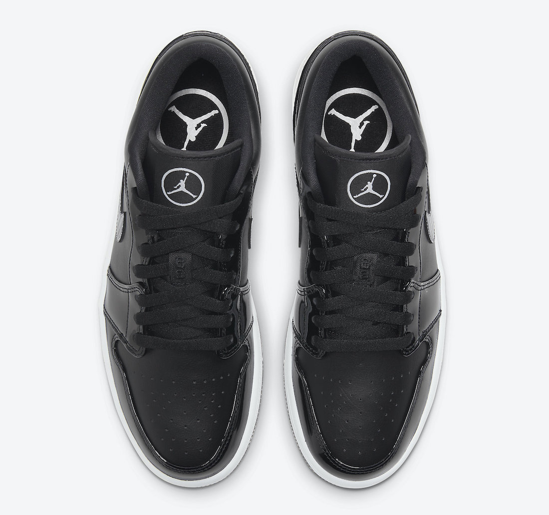其中 Air Jordan 1 Low 就是简单的黑白主题,黑色的皮革和漆皮组成鞋面,白色 Jumpman Logo 和缝线点缀细节。