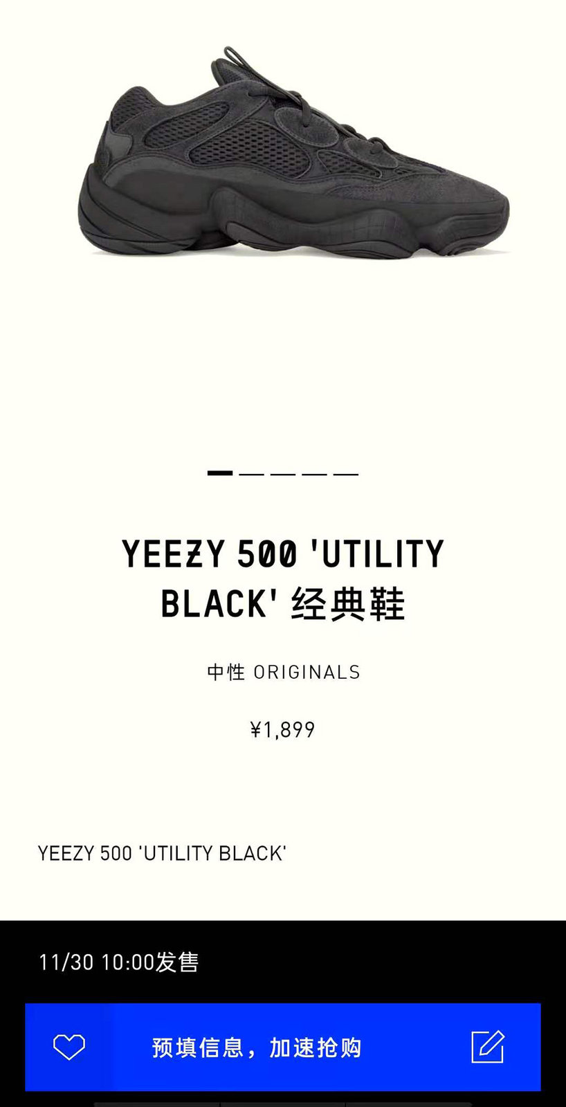 今天打响头一炮的,就是纯黑 Yeezy 500 的补货,与今天黑五的主题格外契合。