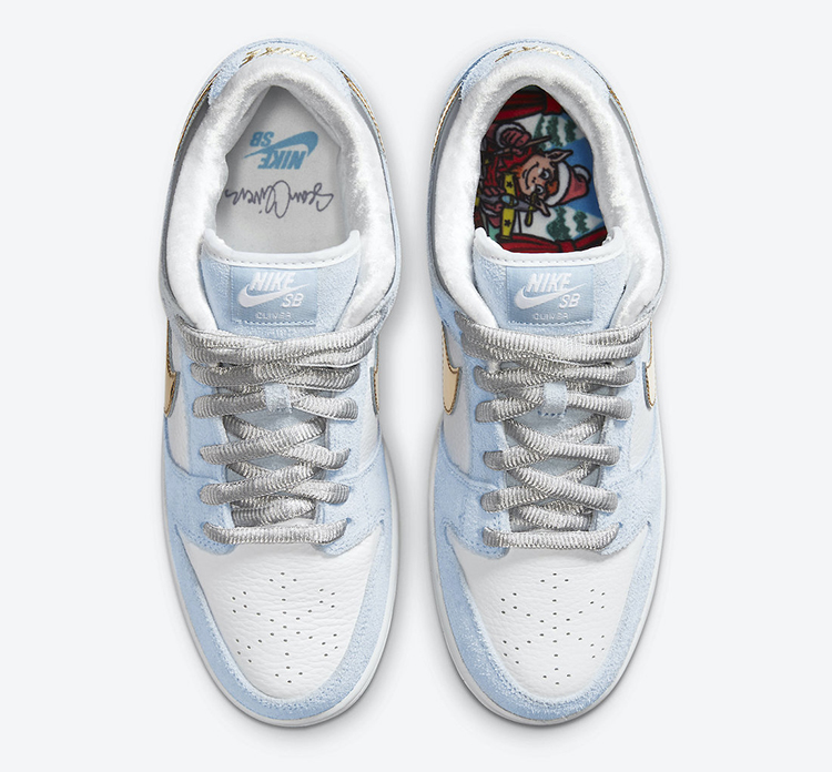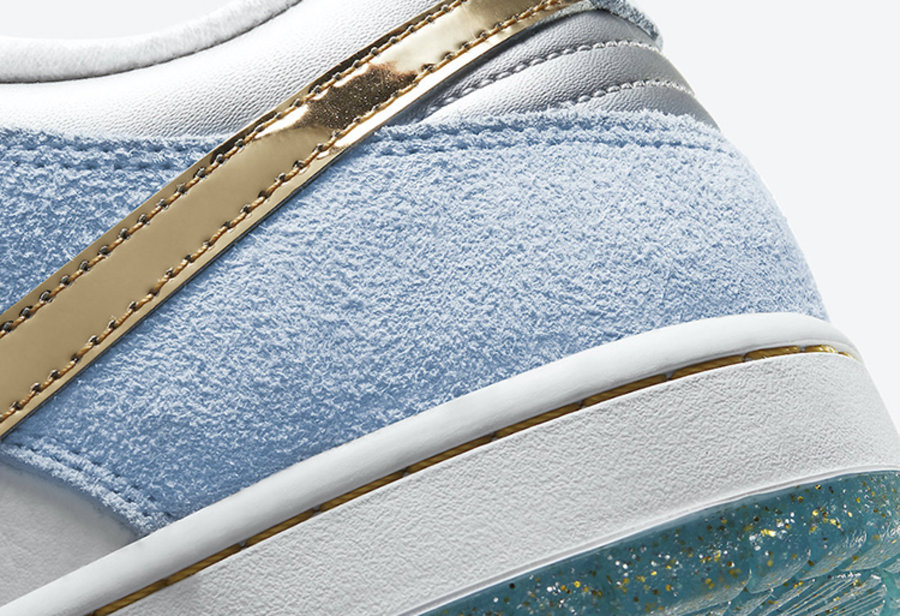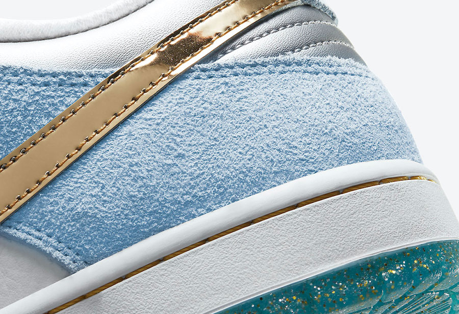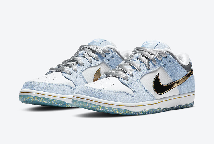 此次全新 Sean Cliver x Nike SB Dunk Low 采用液态金色 Swoosh,点缀白色和浅蓝搭配的鞋身上,显得格外的耀眼。