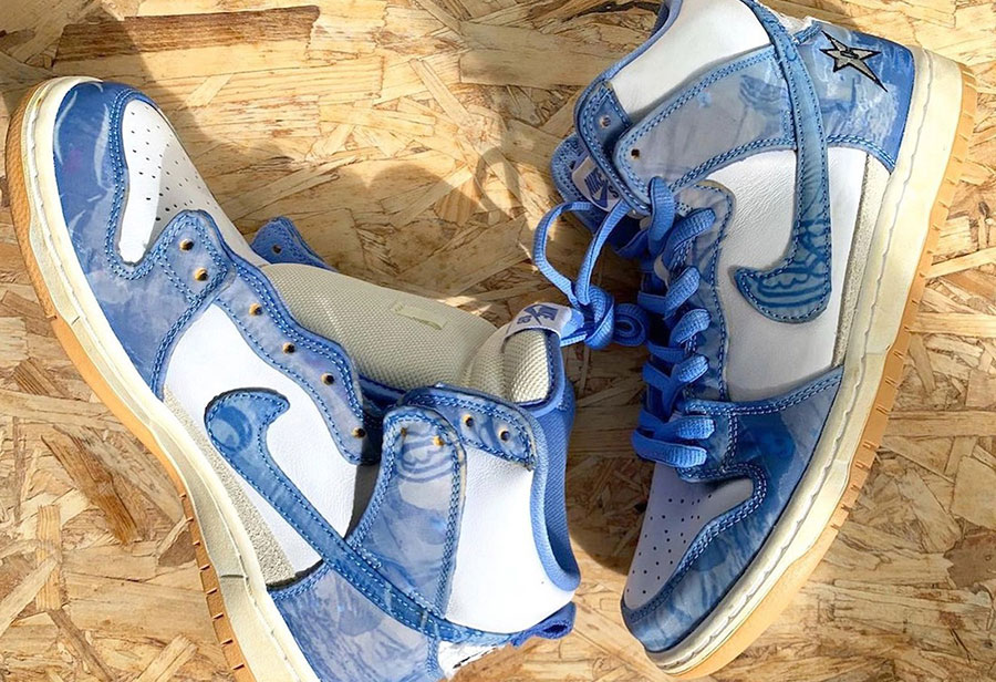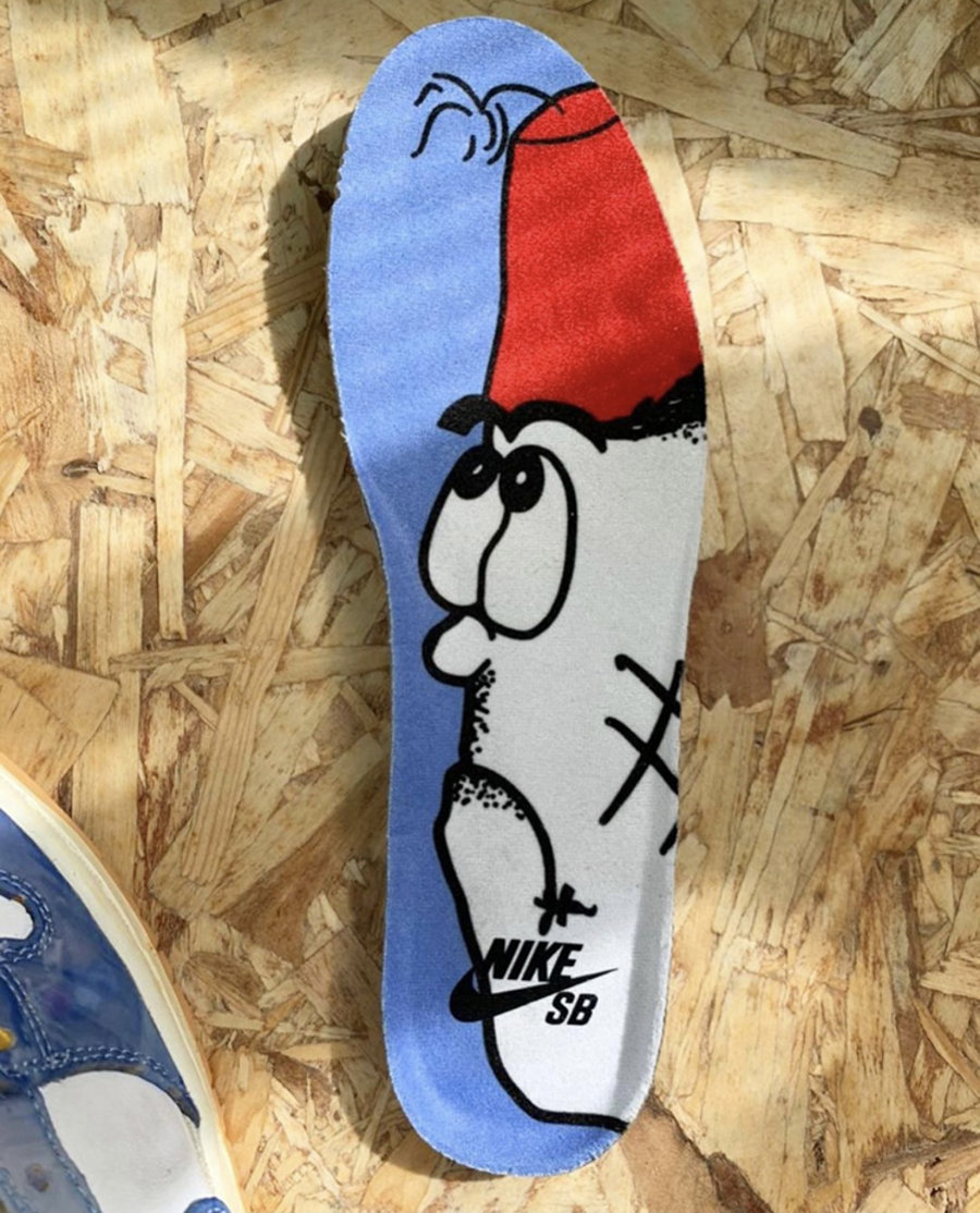 此次双方采用 Nike SB Dunk Hi 为蓝本,鞋面以白色填充,辅以蓝色框架,带来极为简洁的视觉效果。