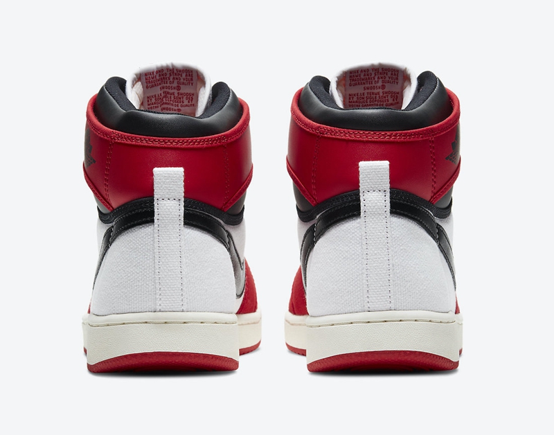 整体造型以黑白红三色呈现,同时采用大面积帆布材质打造鞋面,彰显自身 OG 身份。