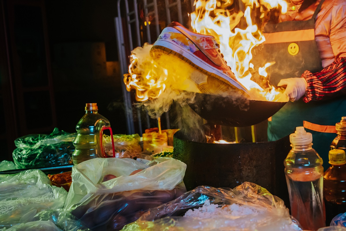 整双鞋以中国街头小吃为灵感,鸳鸯鞋身设计,广州艺术家杰凸凸(Jason Deng)手绘的六幅美食水彩画穿插其中。