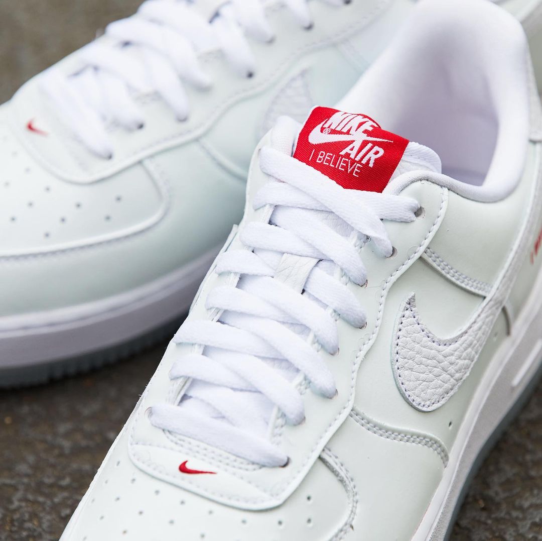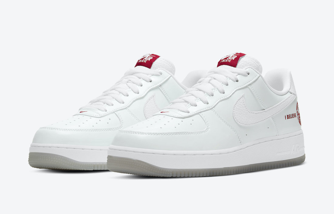 整双鞋以白色为主调,细节中加入喜庆红色,后跟外侧的达摩图案和 “I BELIEVE” 字样呼应配色主题。