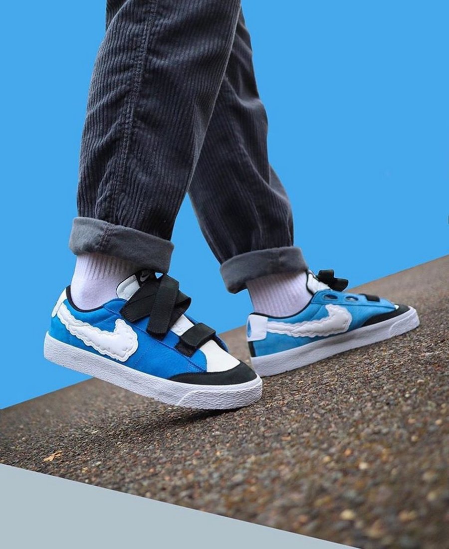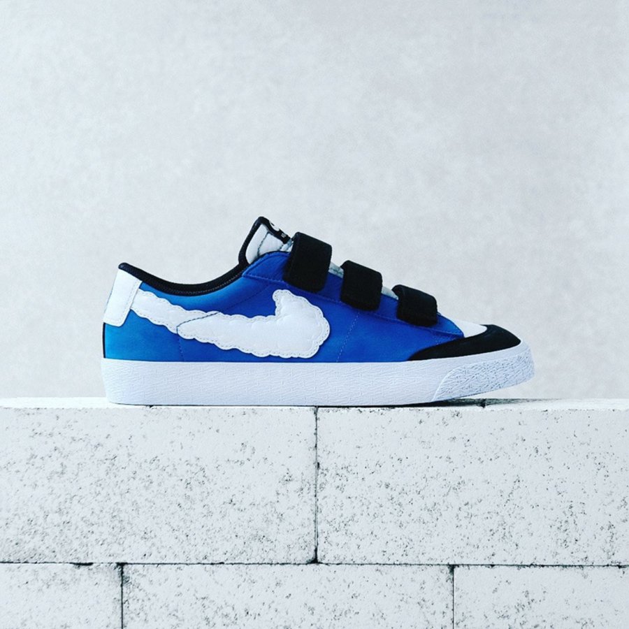 鞋款选用低帮 Nike Blazer Low AC XT 为蓝本,通过蓝、白撞色营造天空的清澈感觉!Swoosh 特别设计搭配黑色魔术贴,整体个性夺目又便于穿脱。