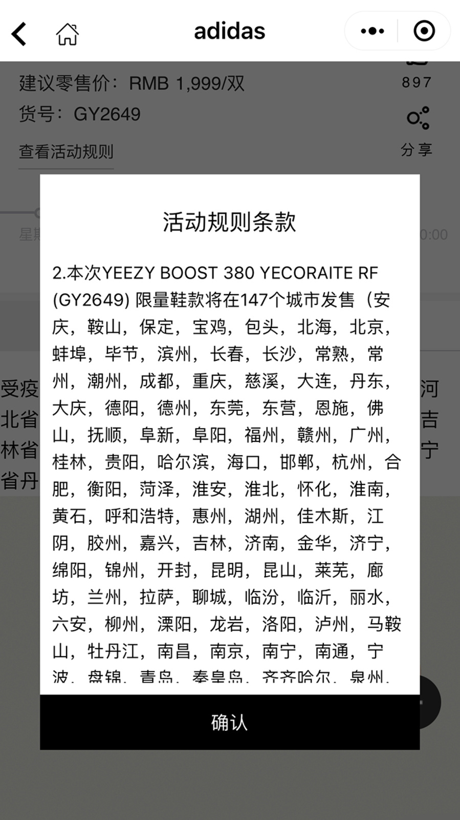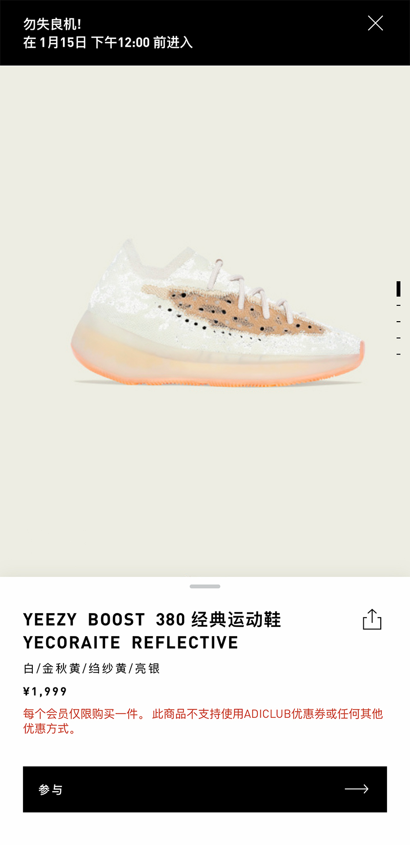 此外,adidas APP 也已开始线上发售登记,报名时间截止 1 月 15 日 12 点,1 月 16 日 10 点开始抽签。