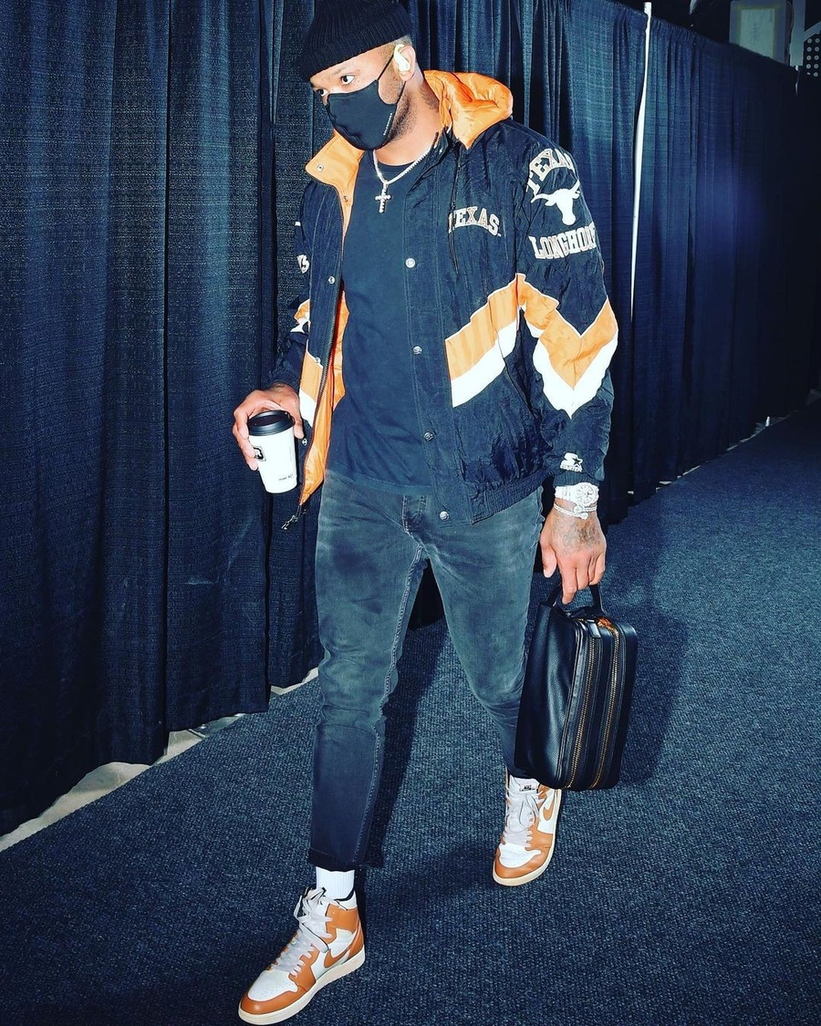 最近塔克穿的狠鞋可真不少,定制版白橙 Air Jordan 1、俄勒冈 Air Jordan 13,赛场上的各种老鞋和 PE 当然也必不可少。