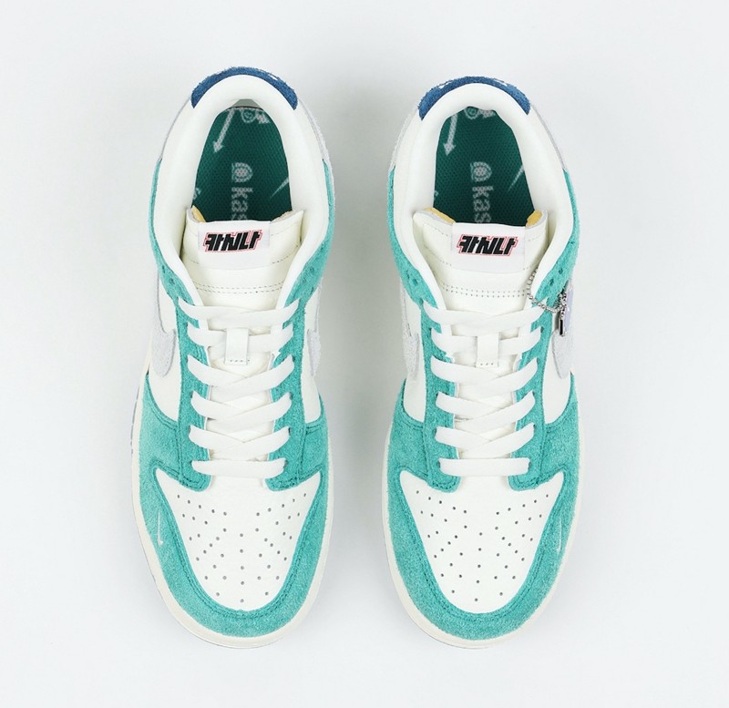 以白色为主调,搭配蒂芙尼绿色框架覆盖鞋身,荔枝皮 + 翻毛皮多材质打造的鞋面,彰显出 Dunk 系列一如既往的高品质规格,同时会更加适合女生上脚。