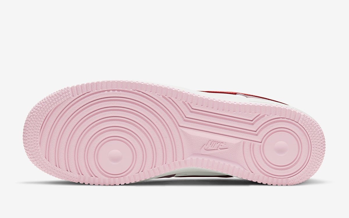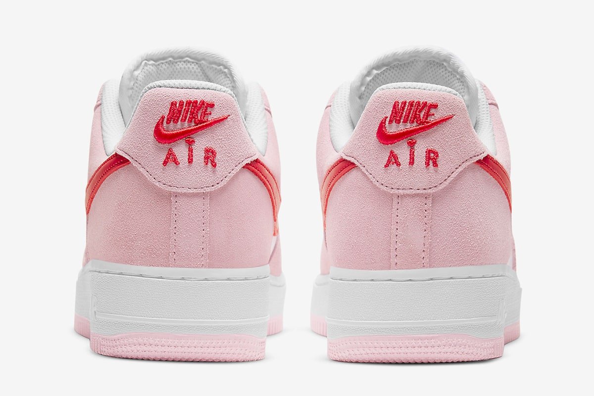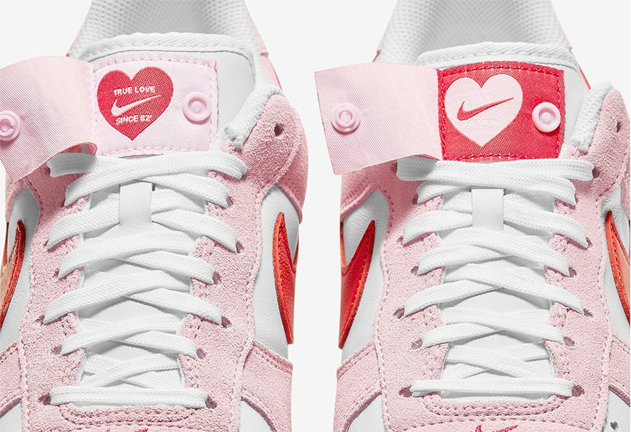 情人节最具代表性的淡粉色和红色融入经典白色 Air Force 1 中,翻毛皮与皮革拼接打造的鞋面提升整体质感表现。