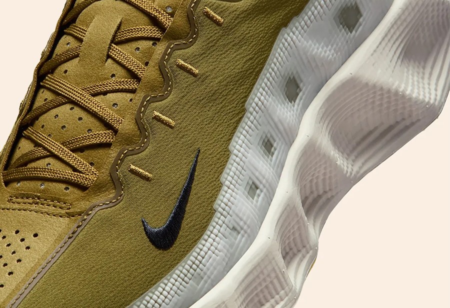 鞋面选用网眼面材质,其上有绒面覆盖,侧身 Swoosh 采用绒面,后掌配有可视气垫。