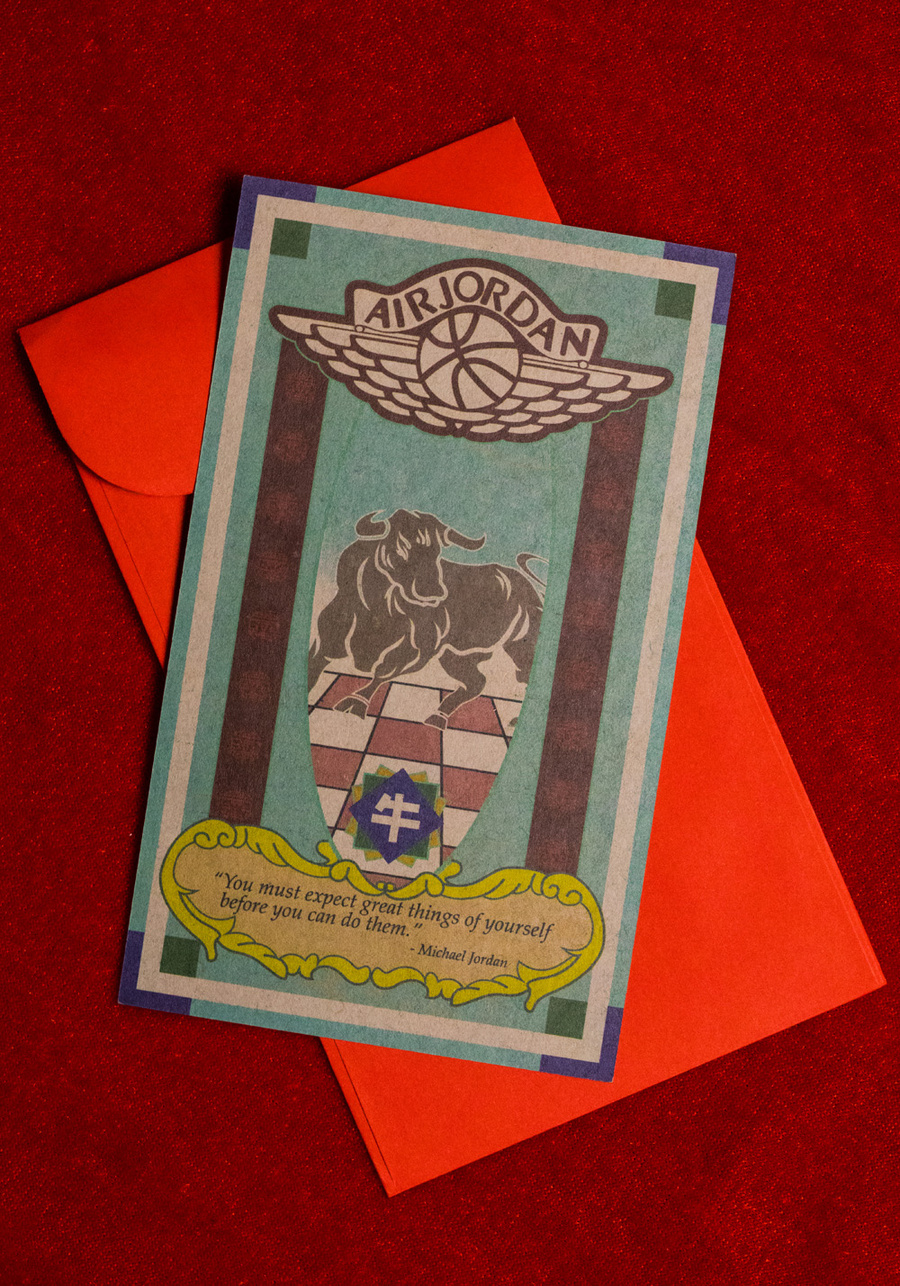 红包内装有节日卡片,正面有牛年趣味插画,背面则有特殊编号标注,代表这双鞋全球限量 8500 双。