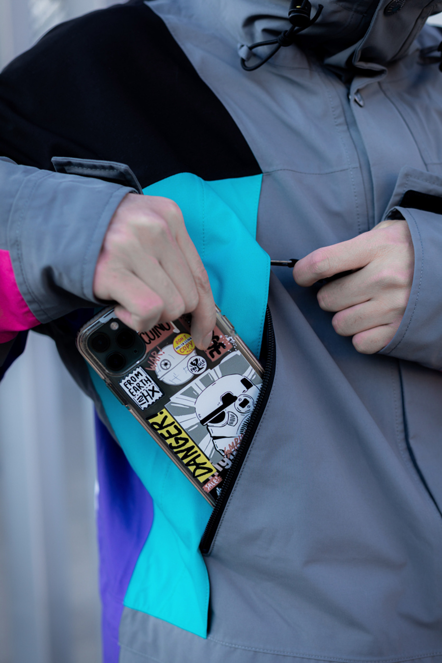 本次合作在口袋上方、手臂部位以及整个背面,都注入了鲜明的反差色调,契合 90 年代街头的复古气质。