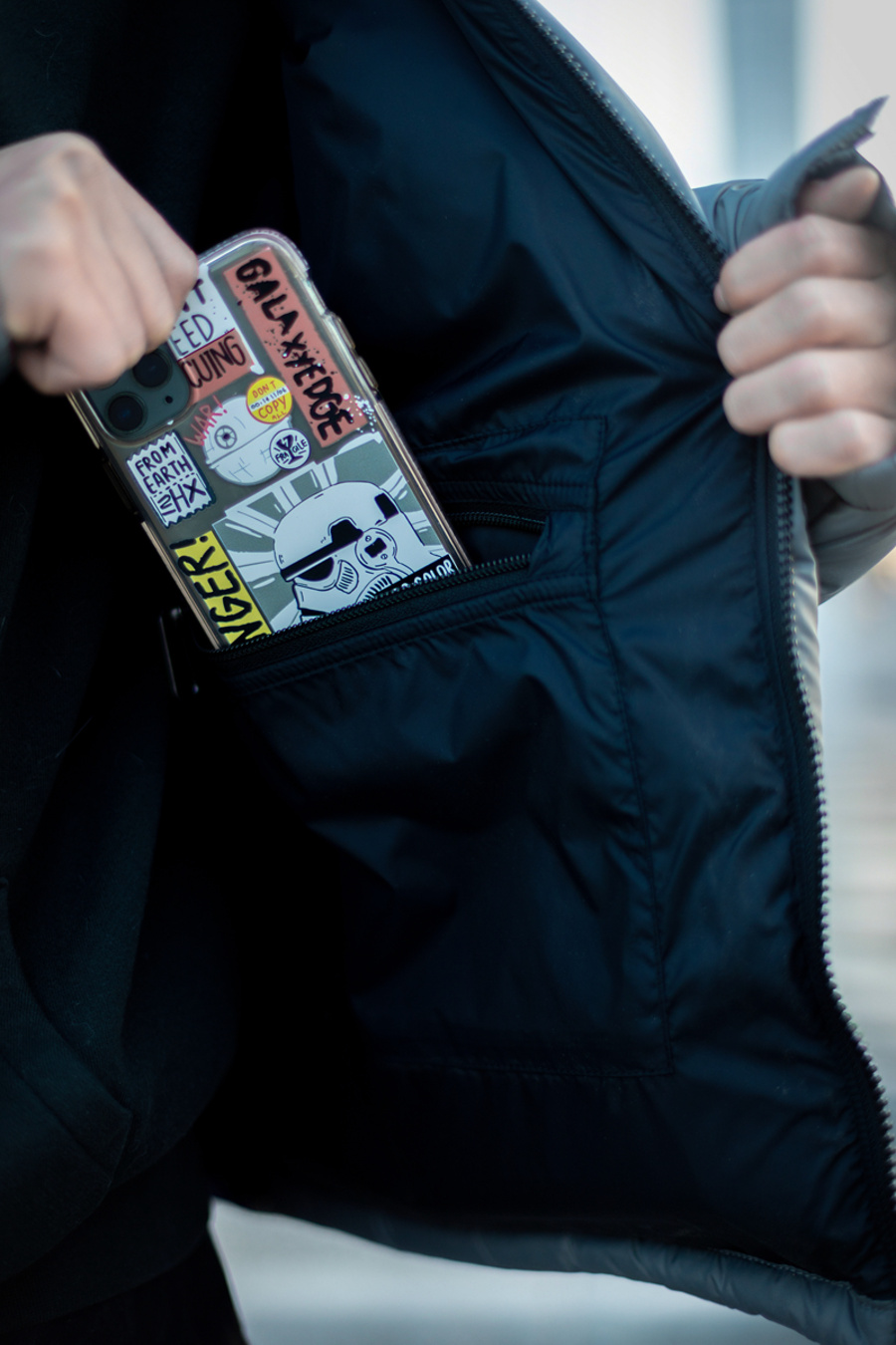 除外侧拉链暖手口袋外,内胆同样设计有储物功能,并额外辅以车线加固。
