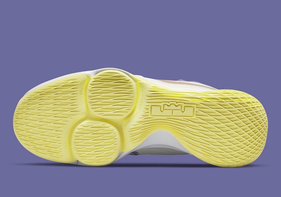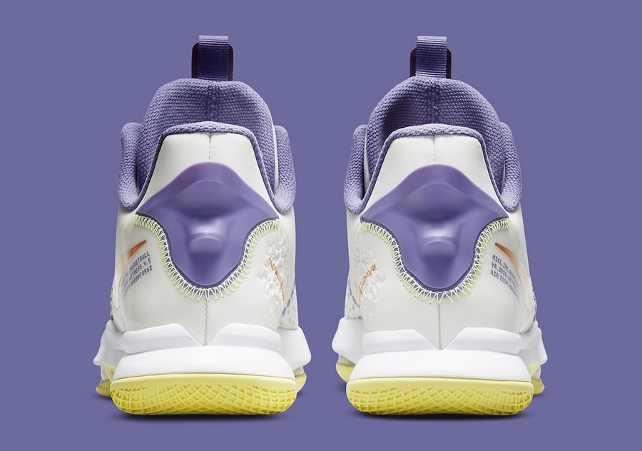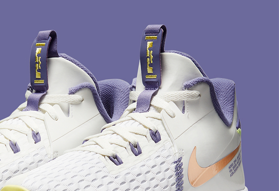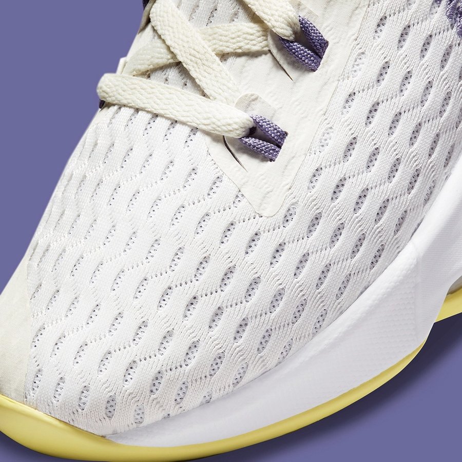 鞋身整体以白色为主,配以代表洛杉矶湖人队的紫色及黄色作为点缀。