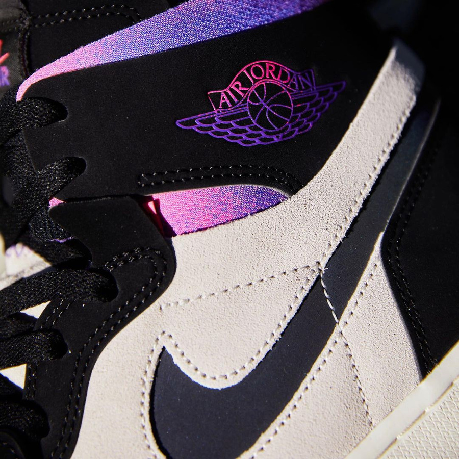 鞋帮处的粉色及紫色渐变扎染呈现出一种颇为绚丽的视觉效果。配以鞋帮处的扎染飞翼 Logo 及后跟处的镭射 Logo,吸睛效果满满。