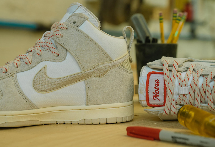 芝加哥球鞋店铺 Notre 和 Nike 联名带来的这双 Dunk High,翻毛皮和帆布搭配,营造了熟悉的 OG 复古效果。