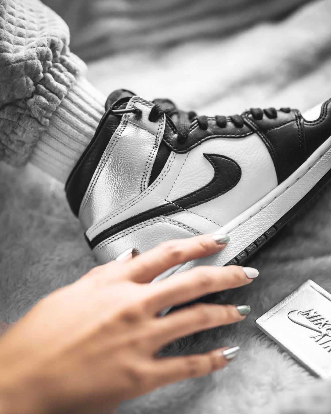黑银脚趾可以说是今年第一双高颜值大货量的 Air Jordan 1,荔枝皮鞋面看着质感确实高级,黑脚趾加上液态银的中性风格男生女生都能穿。