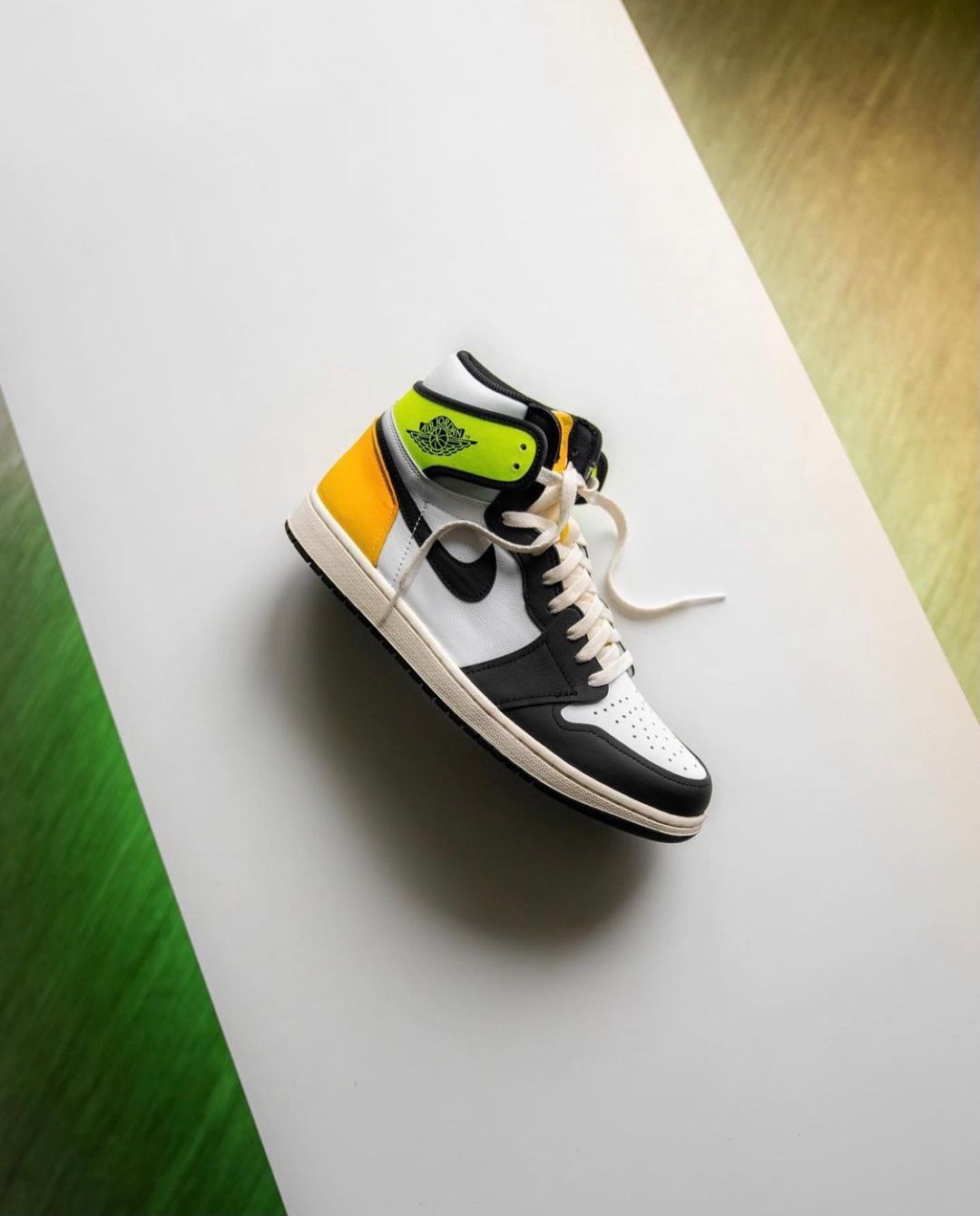 今年登场的第一双 Air Jordan 1 就是黑脚趾新成员,因为鞋帮上醒目的橙色和荧光绿点缀被称为「黑橙脚趾」。