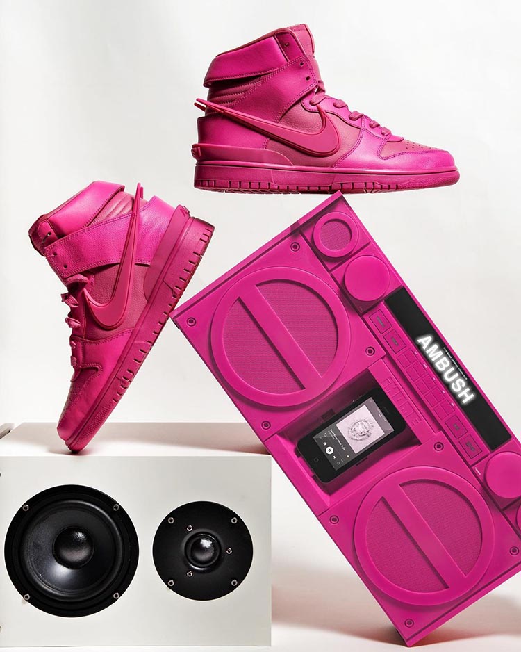 第二款 AMBUSH x Nike Dunk Hi 在上个月正式发售,扎眼的骚粉色虽然能够把气质拉满,但是与「粉猪」一样上脚很难驾驭。