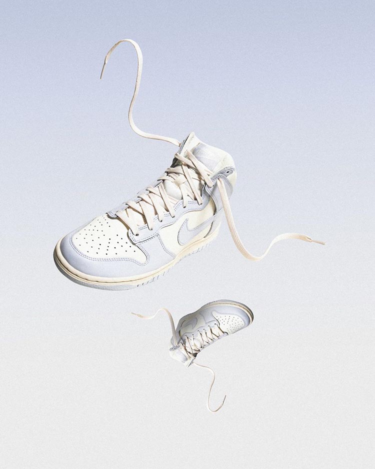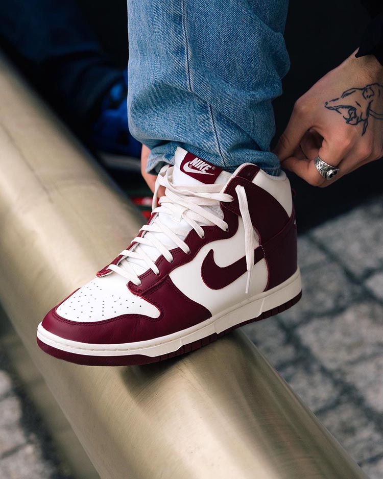 上个月月底发售的「酒红」Nike Dunk Hi 依旧承袭了经典 Dunk 的配色设计,乳白色搭配酒红色,复古韵味十足。