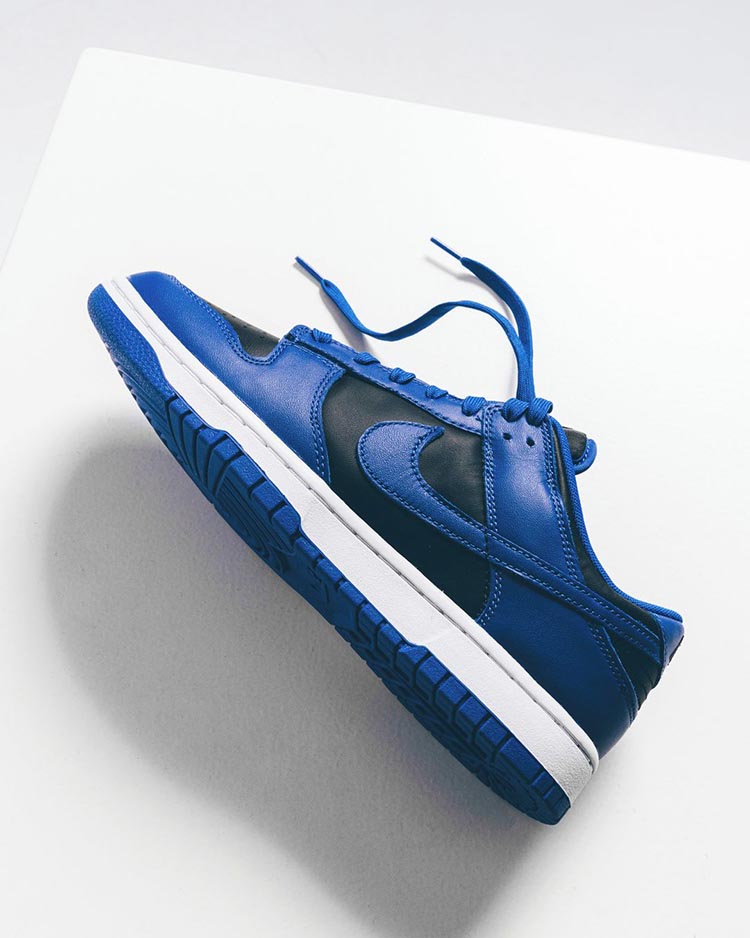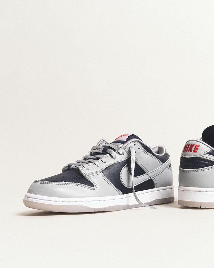 鞋身框架采用灰色打造,沉稳的海军蓝色填充,搭配普通 Dunk Low 少有的乳白色水晶外底,完善整双鞋的设计。