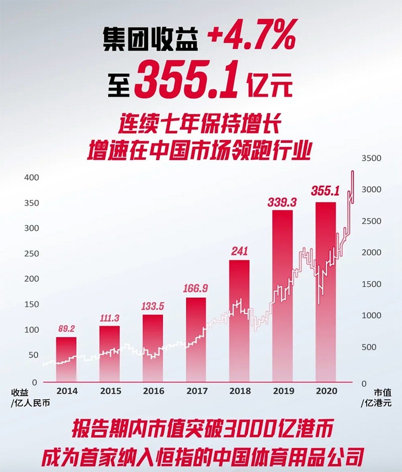 营业收入上对比李宁、特步、361° 等国产运动品牌,也更加巩固了国产体育服饰品牌头把交椅的地位。
