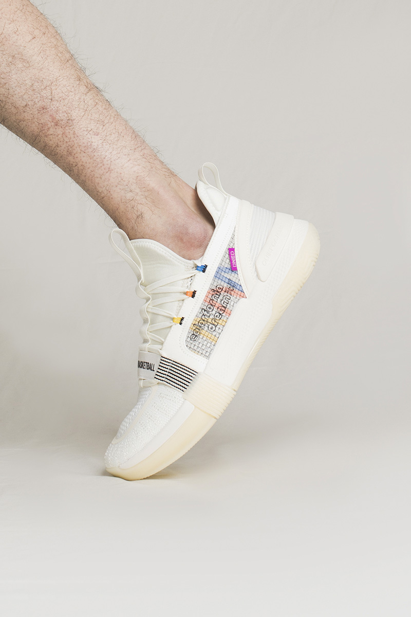 鞋身采用织物、皮革框架及半透明蝉翼共同构建。