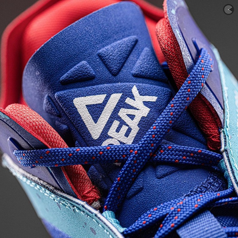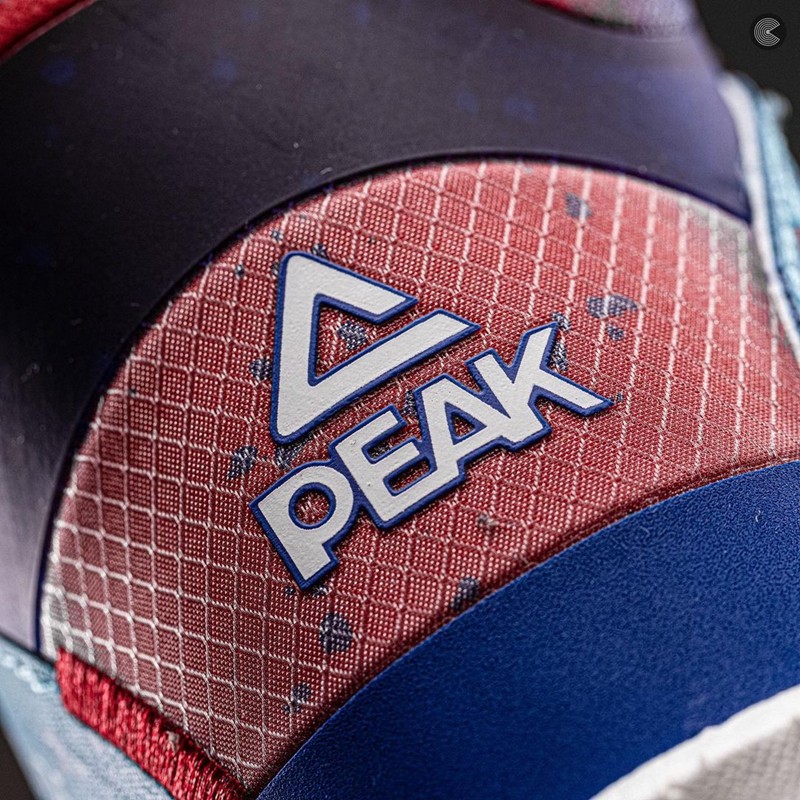 整双鞋采用白、蓝、红三种颜色组成,编织材质打造的鞋面点缀上硕大的匹克三角形 Logo,视觉效果十分吸睛。
