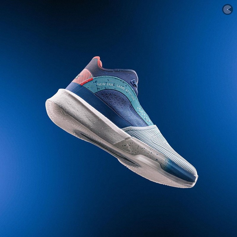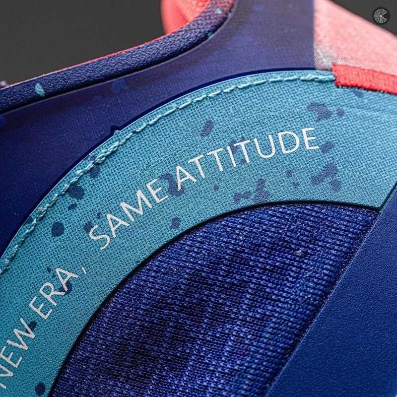 鞋帮上以蓝色打造,并写有 “NEW ERA,SAME ATTITUDE” (新时代,同样的态度)字样,传递了复古外表下却有着最新的配置。