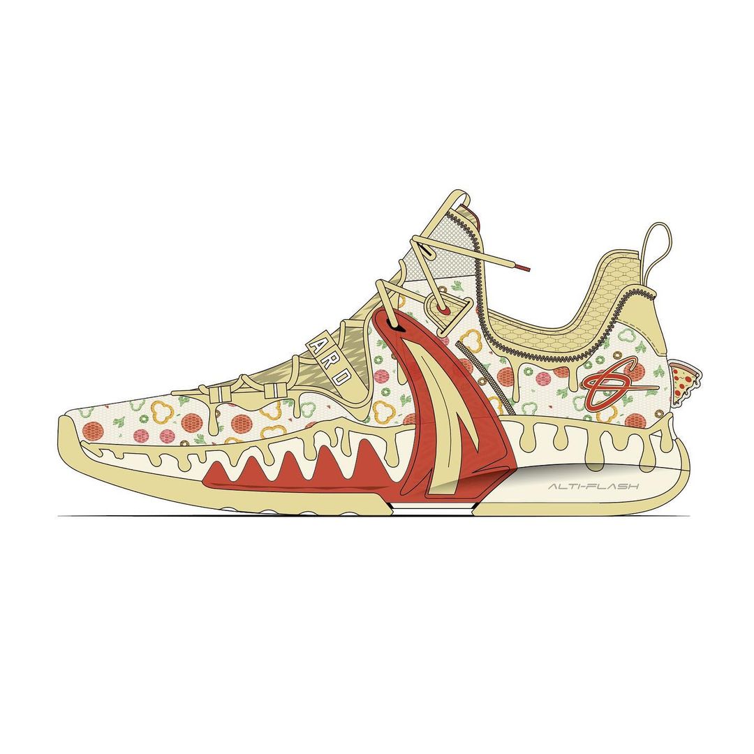 适当的红色装扮,令人不由得想起披萨表面的酱料,搭配上安踏标志性 Logo,整体造型相当和谐。