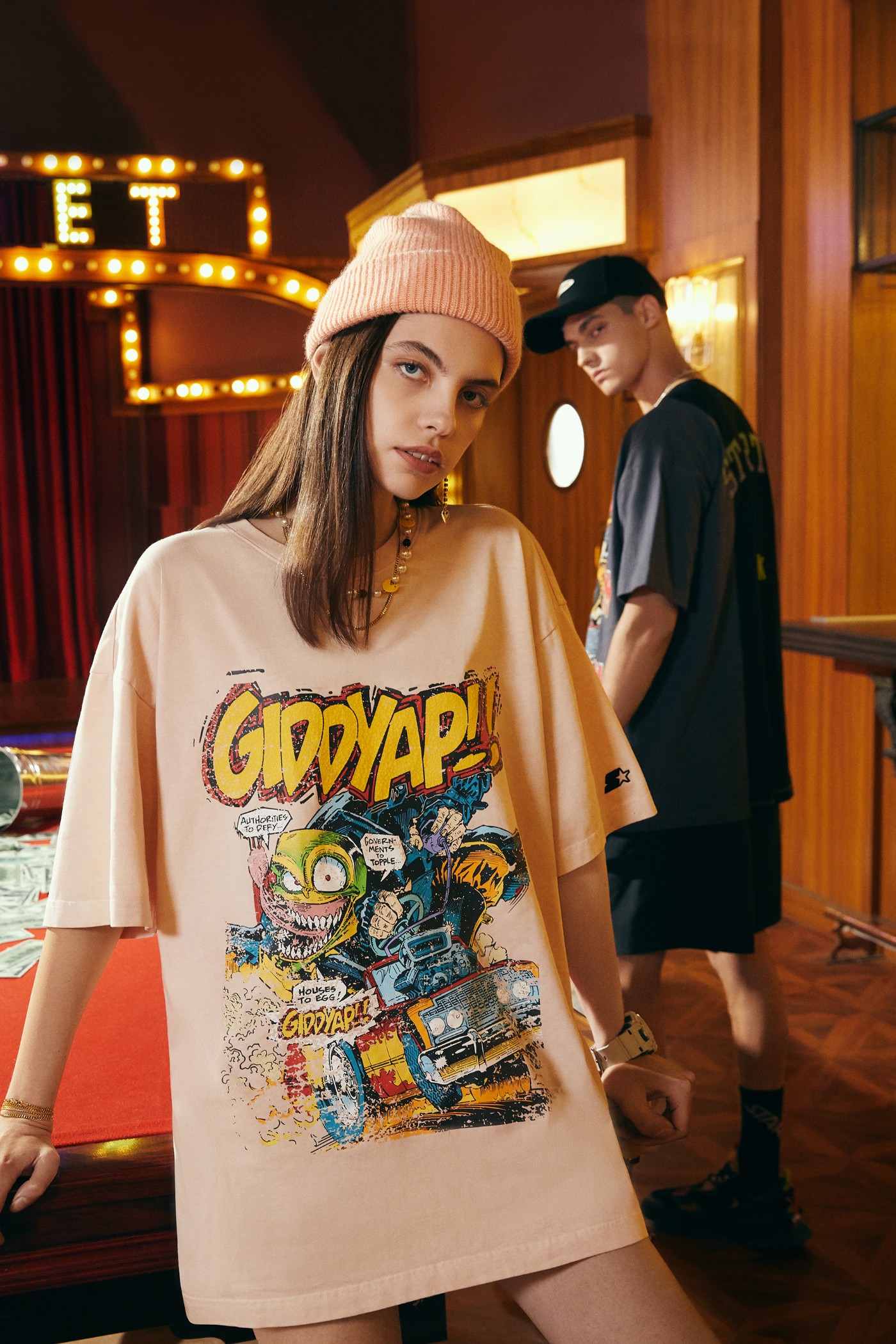蛀虫纱面料的T恤,布面呈现不规则虫蛀风格,加以撞色绣线的使用让款式的外观更为独特,搭配上THE MASK 漫画形象设计,提高款式的潮流属性。