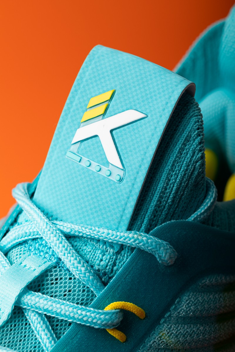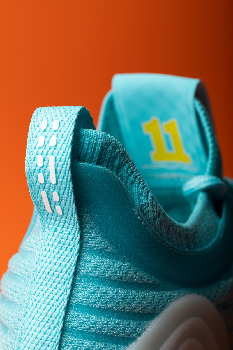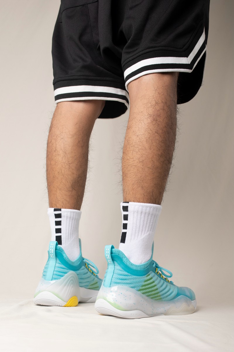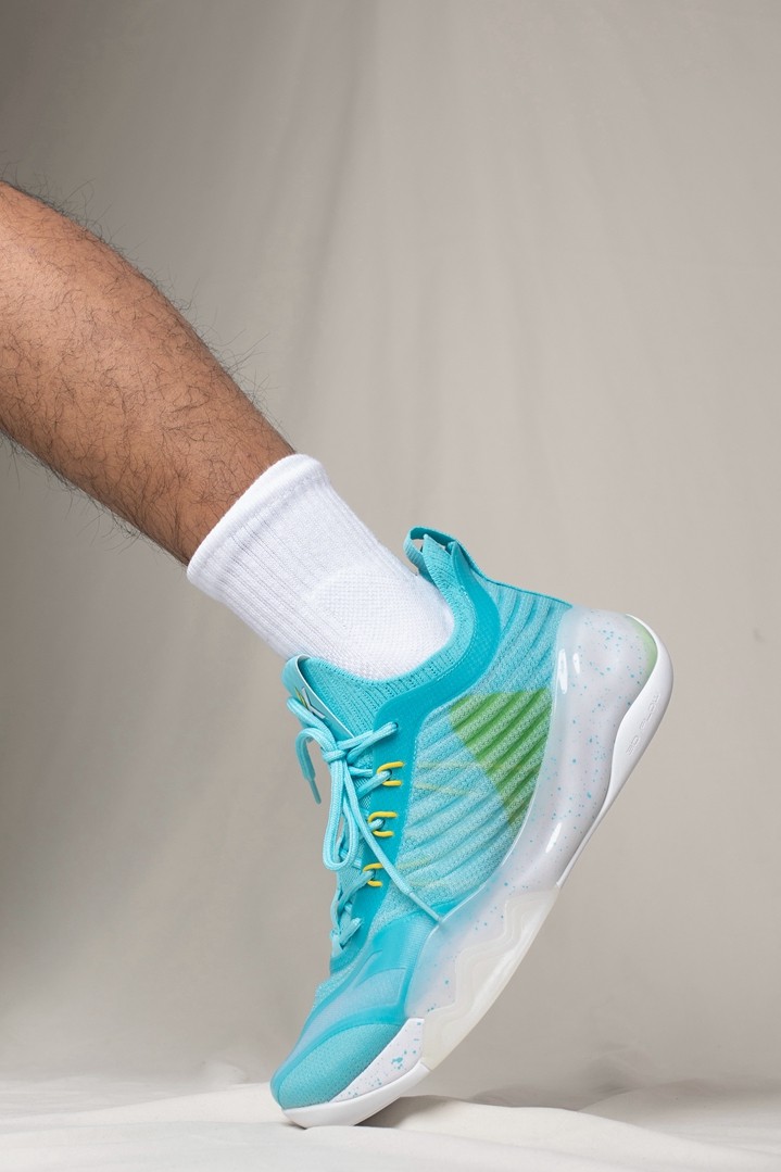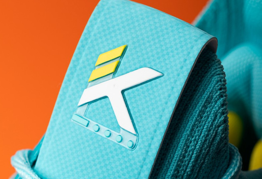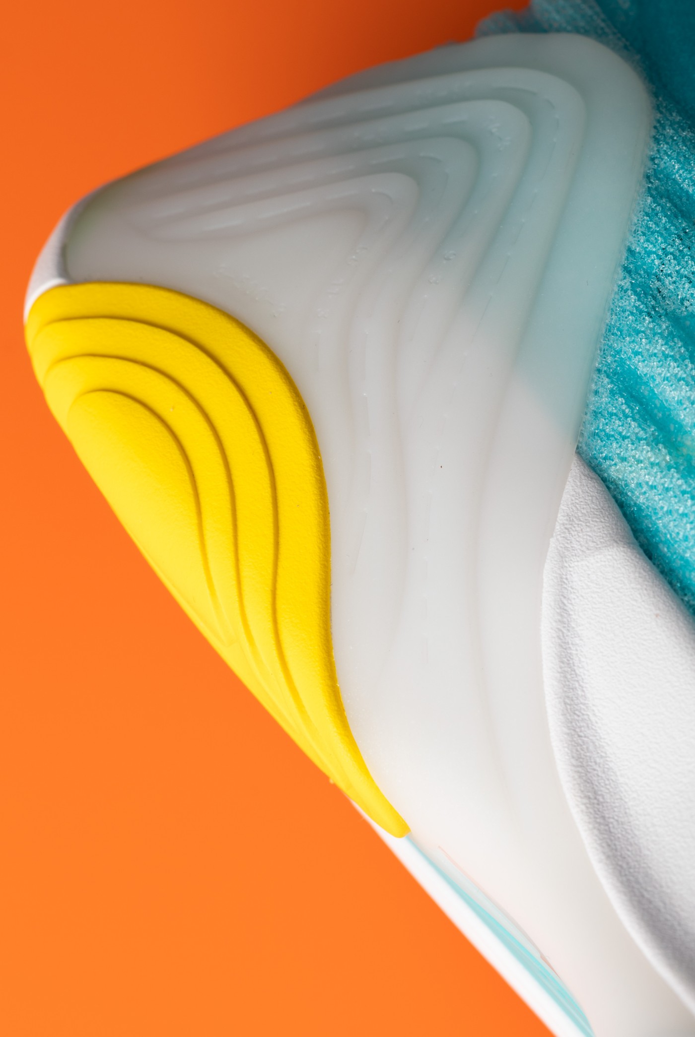 大面积湖水蓝色充斥鞋面,细节处加入亮黄色点缀,释放出清爽的夺目气息。