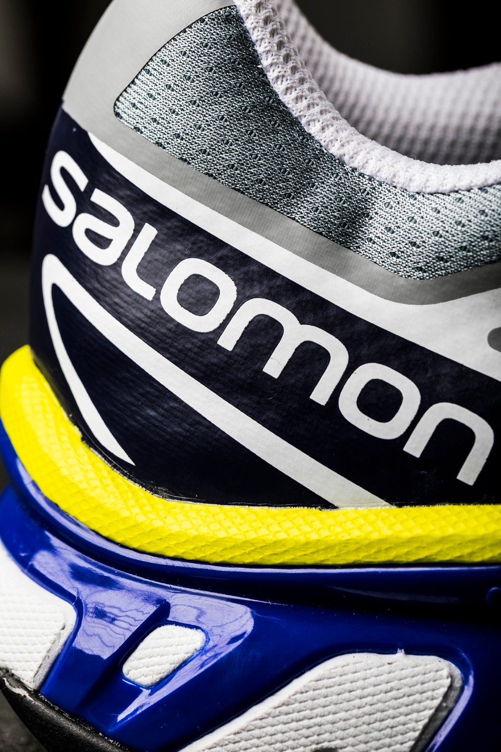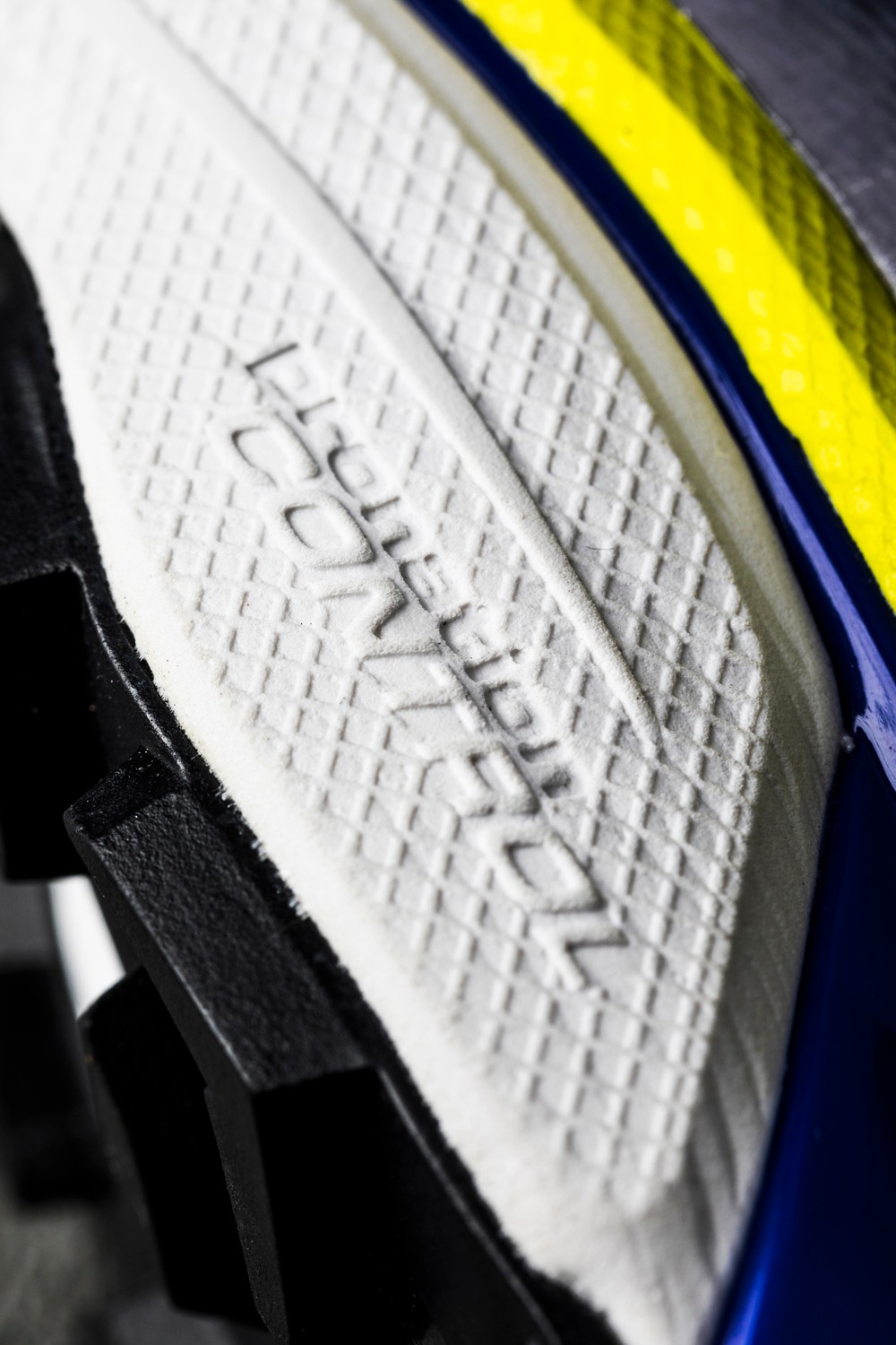 后跟环绕深蓝色 TPU,为后跟提供稳定支撑,夸张醒目的 Salomon 字样,彰显出品牌身份,