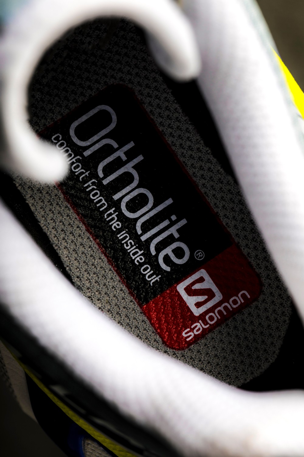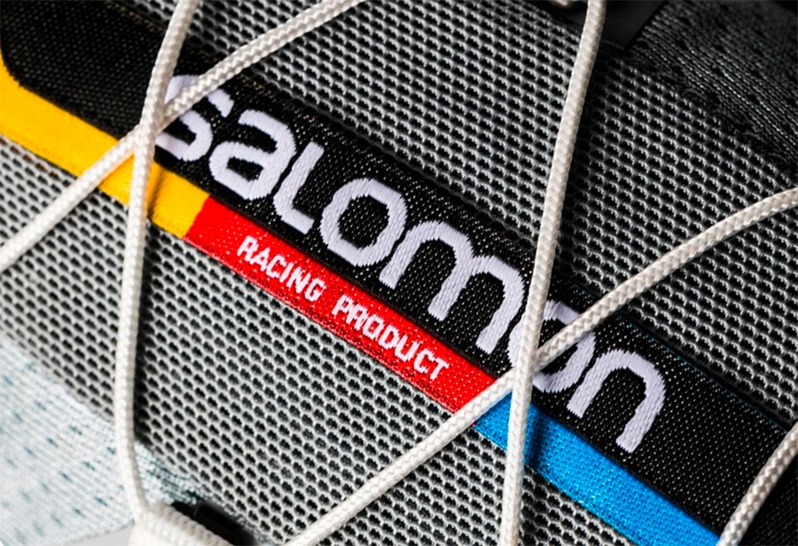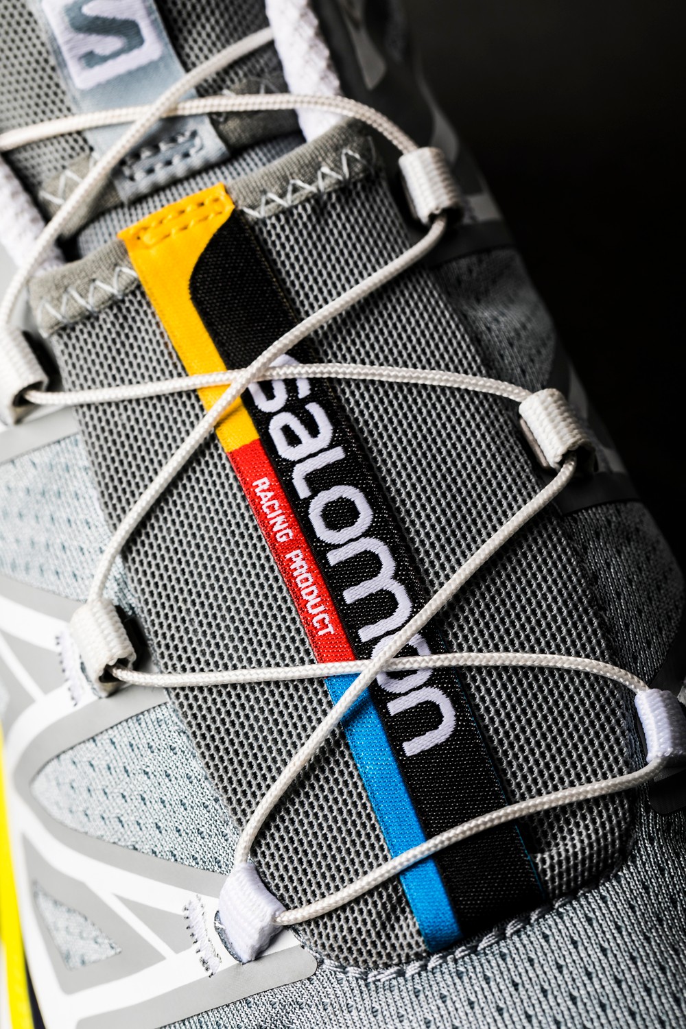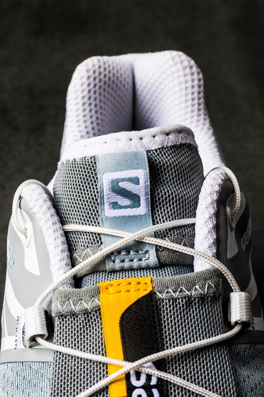 鞋舌由针织材料打造,延伸至鞋面的标签上标有 Salomon 字样,并点缀红、黄、蓝色条,细节感十足。